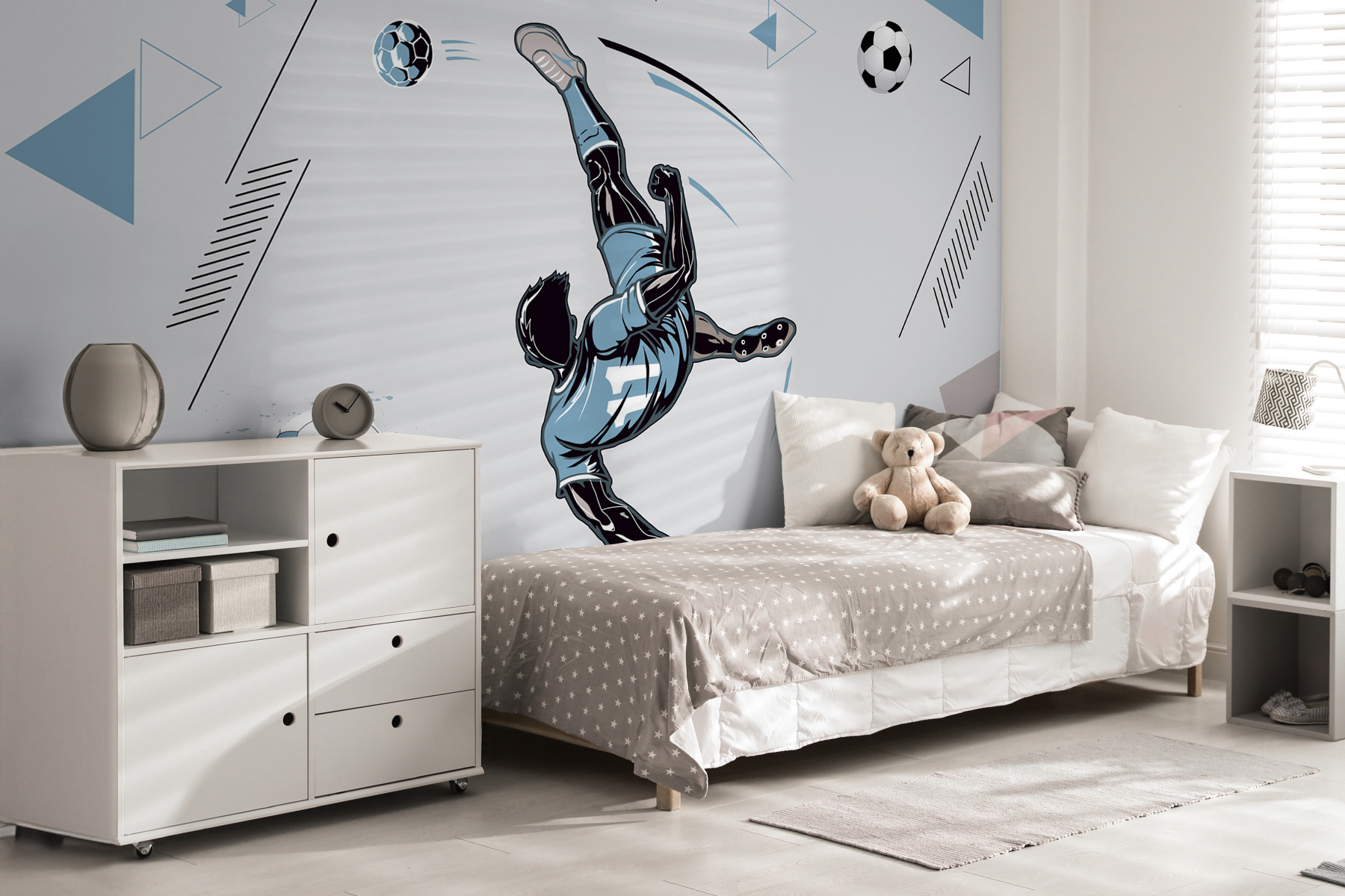 Este o alegere fantastică pentru o cameră de jocuri, un dormitor pentru adolescenți sau chiar o zonă de zi în care doriți să păstrați lucrurile pline de viață. În plus, amestecul de forme geometrice moderne din fundal adaugă o notă artistică cool. Prietenii vor intra și vor simți acel val de entuziasm, ca și cum ar auzi mulțimea răcnind la un meci mare.