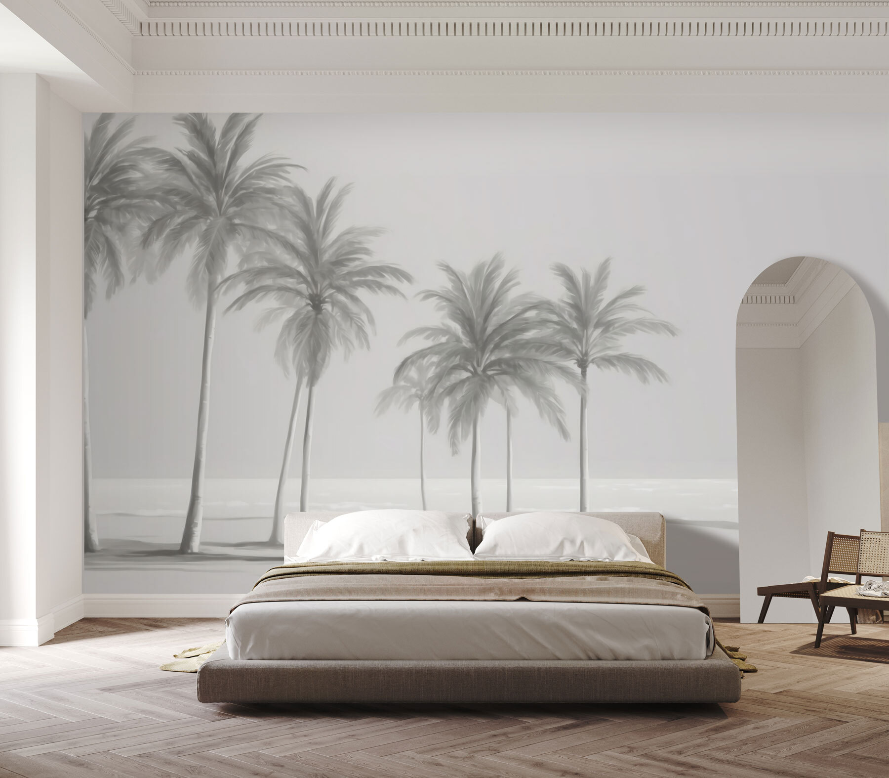 Această pictură murală prezintă o scenă cu mai mulți palmieri înalți și eleganți care se leagănă ușor ca și cum ar fi atinși de o briză de coastă. Culorile blânde și stinse fac ca imaginea să pară aproape de vis, un pic ca o fotografie de epocă care surprinde o zi calmă la malul mării. Se potrivește perfect cu orice decor – modern, boho, orice. În plus, este foarte reconfortantă; genul de priveliște care te face să expiri instantaneu.
