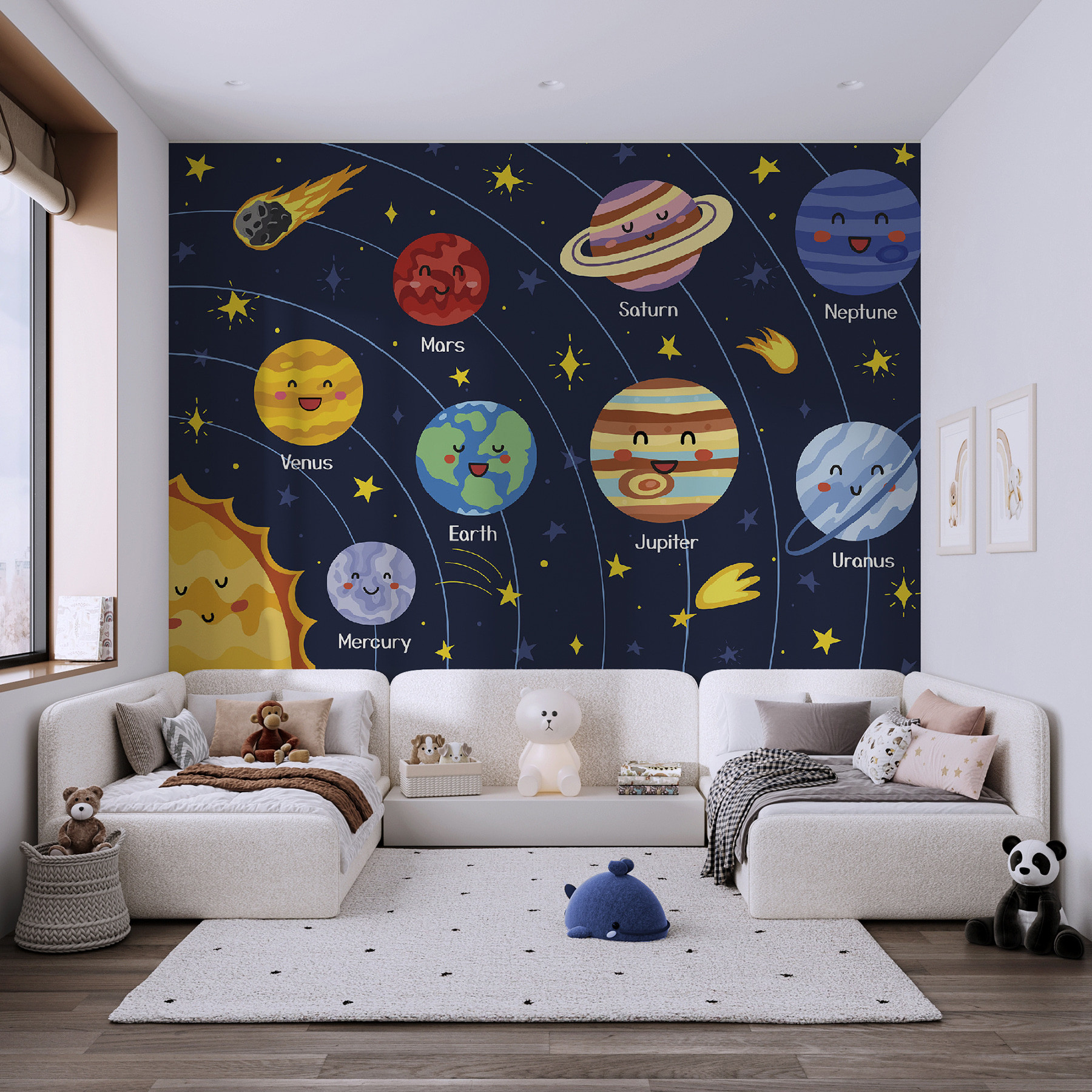 Căutați să condimentați camera copilului dvs. cu un farmec ieșit din comun? Aruncați o privire la acest mural adorabil “Desen animat al unei planete”! Perfectă pentru micii astronauți și privitori de stele, aceasta prezintă o scenă de galaxie distractivă și colorată. Planetele au cele mai drăguțe fețe – aproape că vă cer să bateți din palme. Imaginați-vă că fața copilului dvs. se luminează în timp ce adoarme sub un univers care le aparține în totalitate.