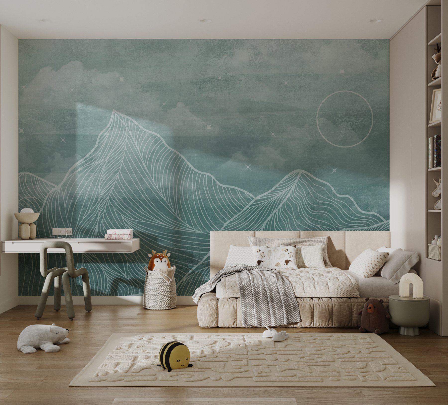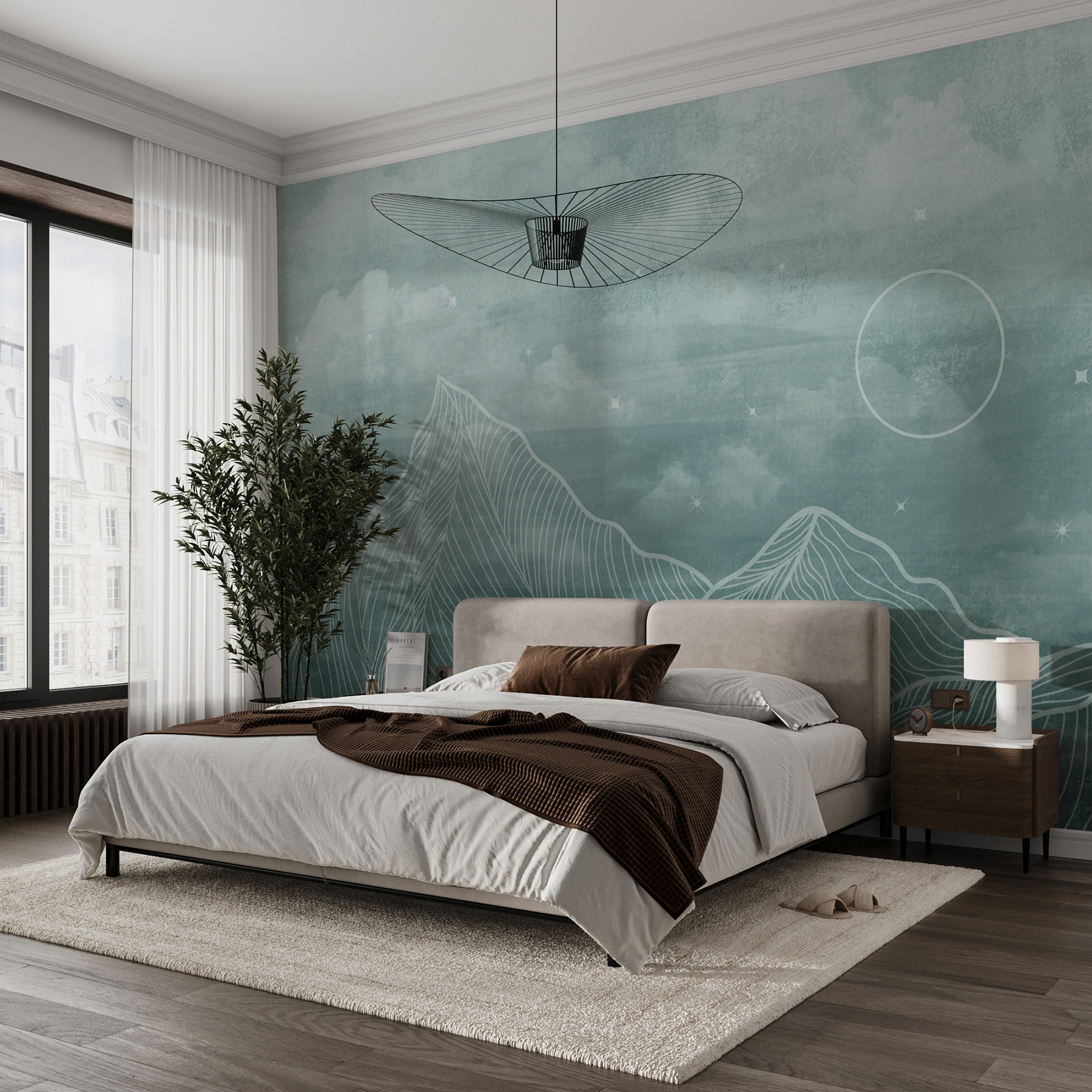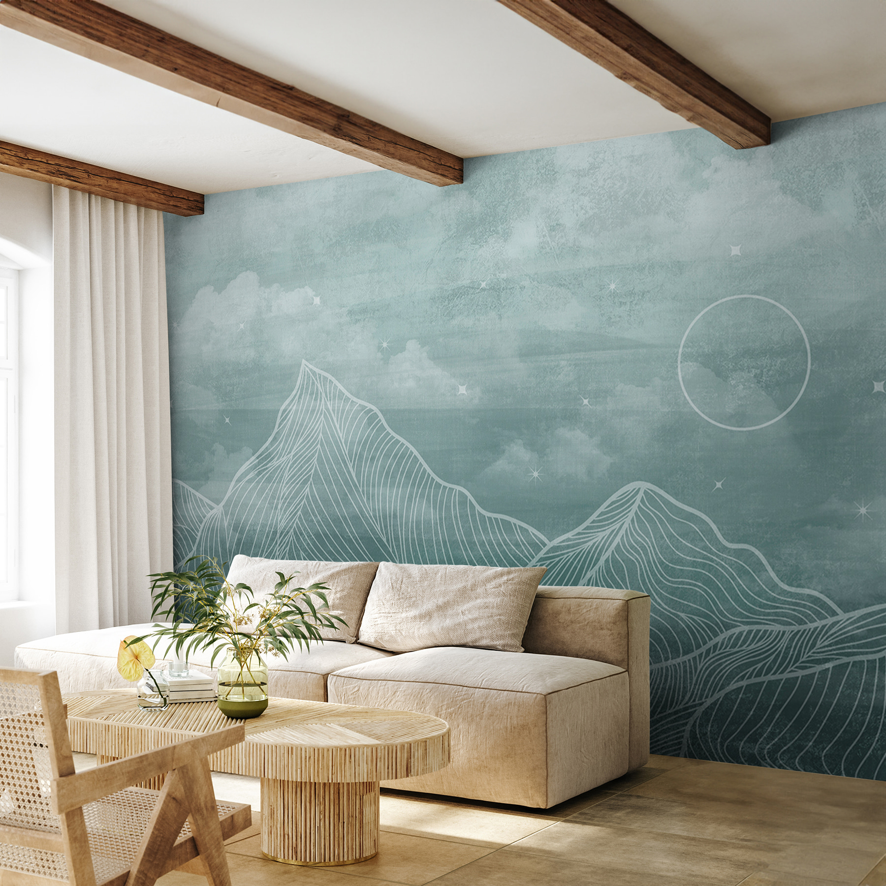 Dacă doriți să adăugați o notă de magie senină spațiului dvs., acest mural “White Circle in a Circle” este ca o invitație la visare. Imaginați-vă munții blânzi și cețoși – cu liniile lor blânde și curgătoare – atrăgându-vă într-o retragere liniștită. Perfectă pentru un colțișor confortabil sau chiar pentru un perete de referință în camera dvs. de zi.