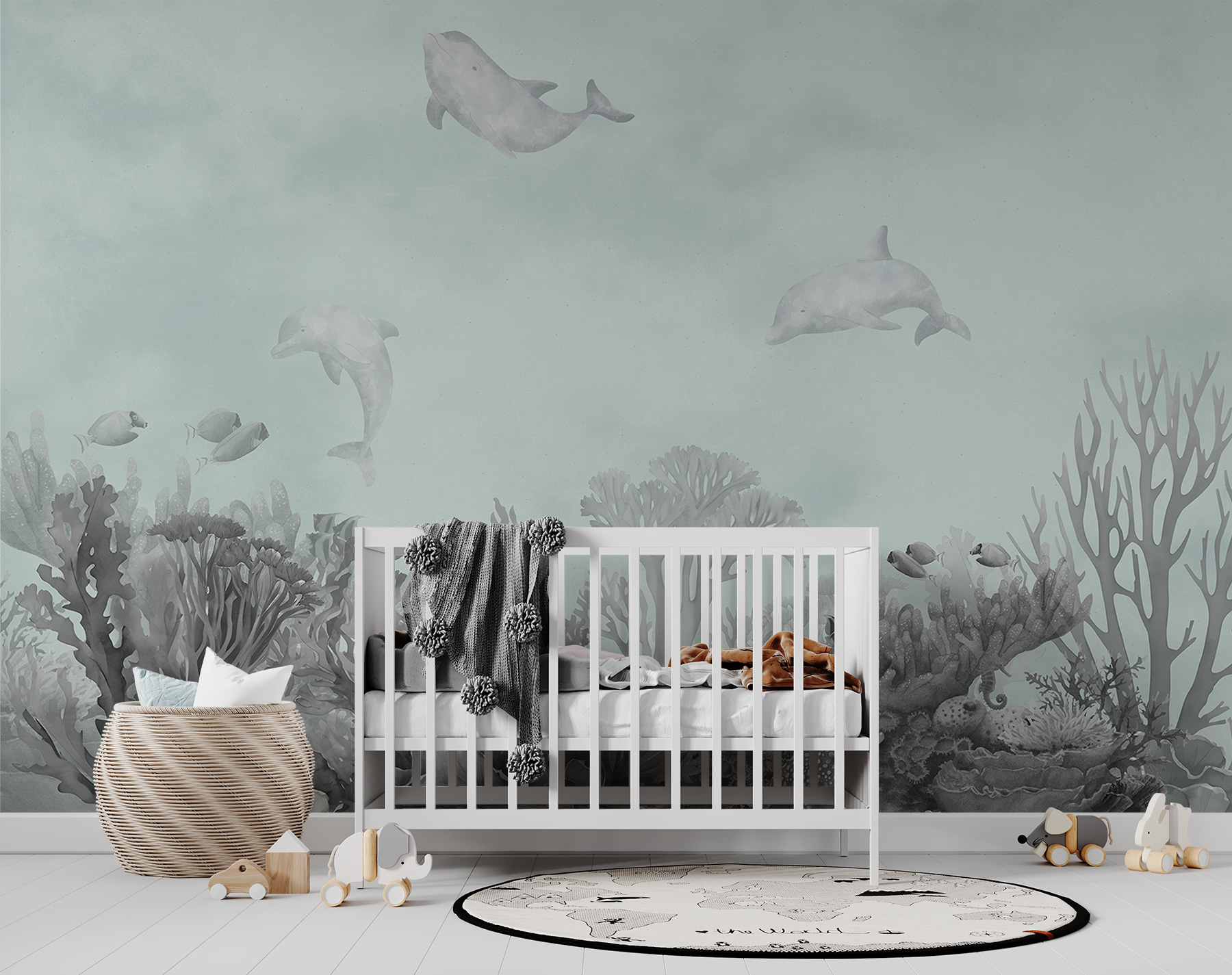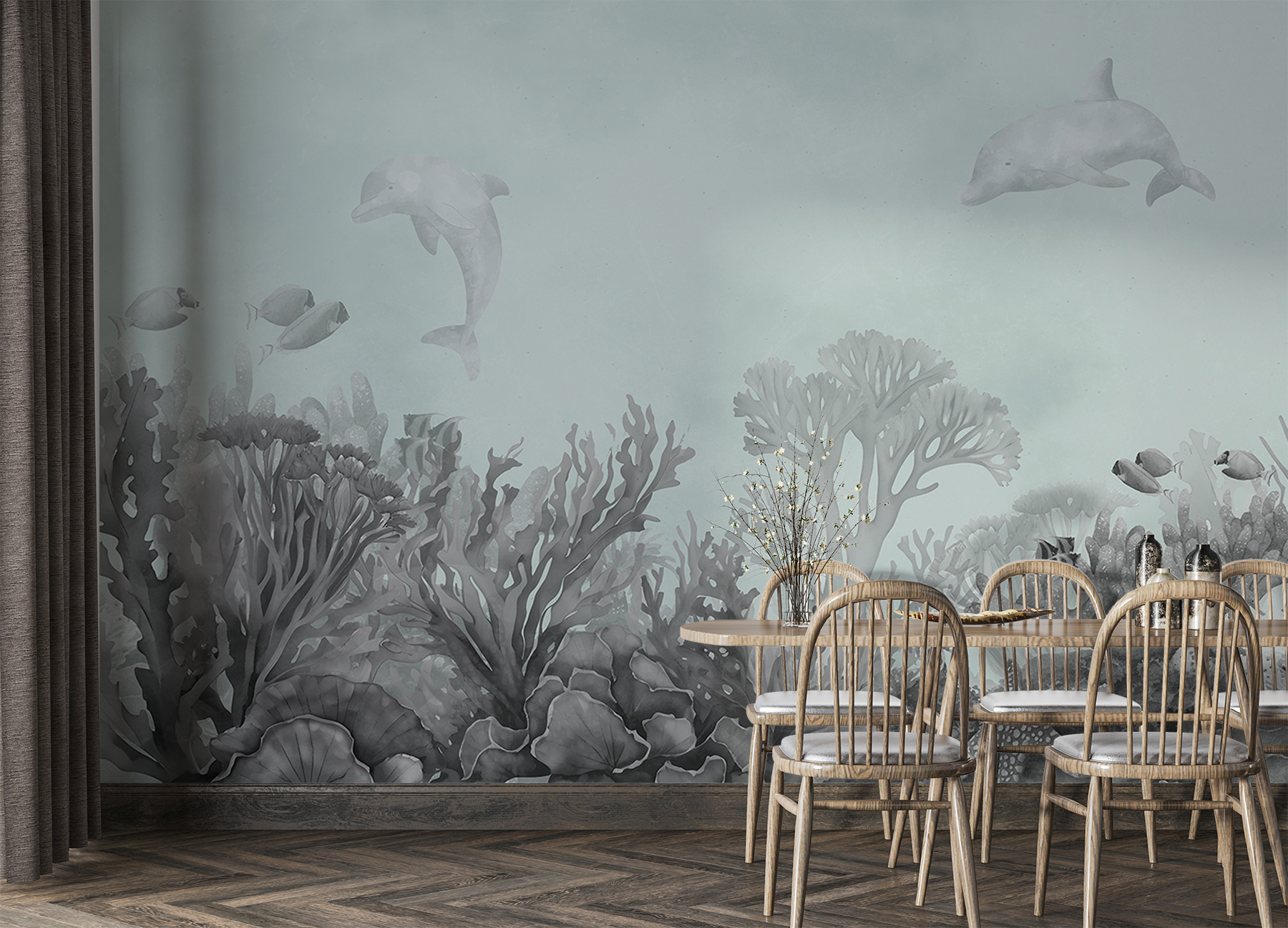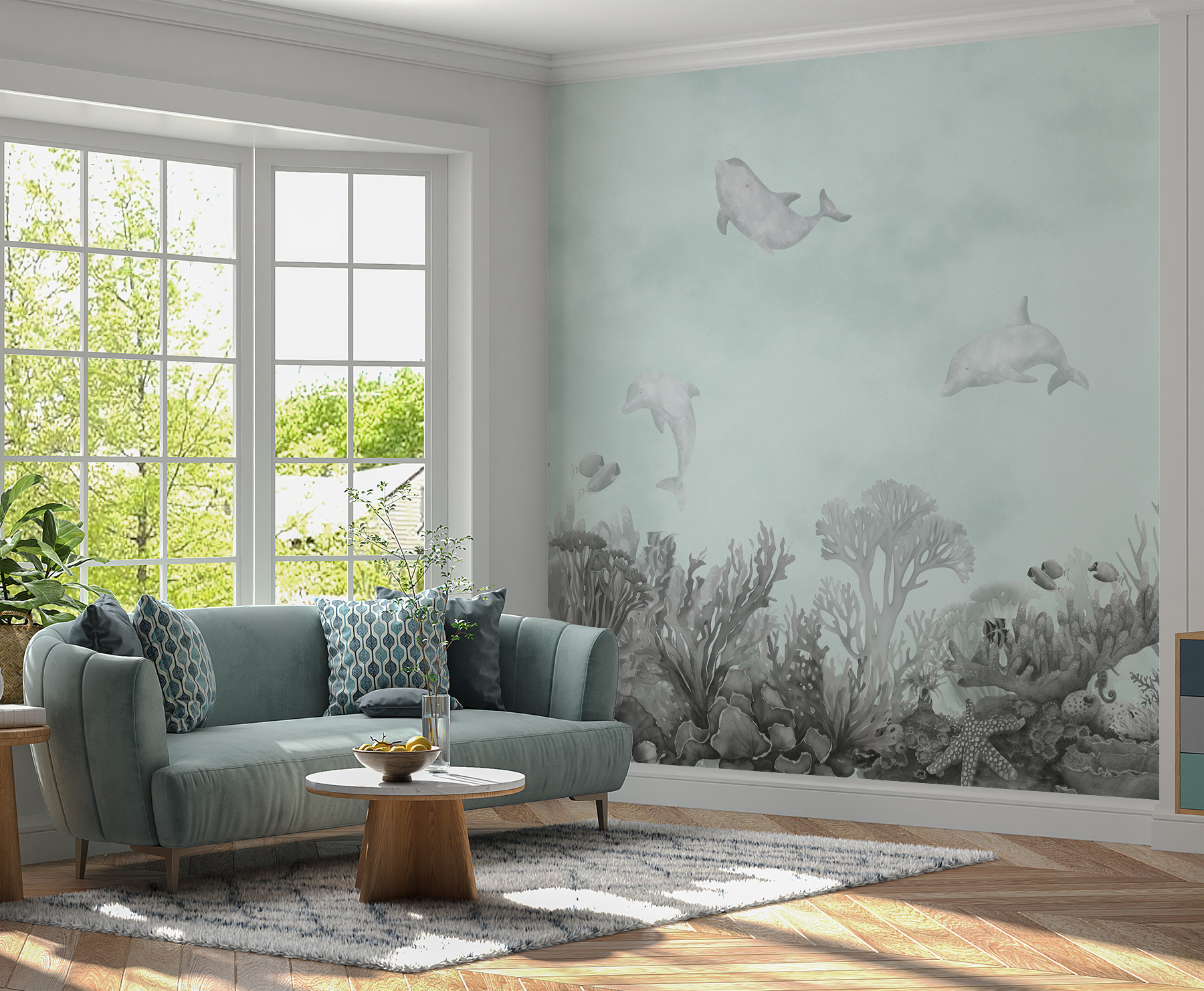 Delfinii pe perete? Da, vă rog! Această pictură murală “Delfin pictat pe perete” are ceva cu adevărat magic. Imaginați-vă că vă uitați în sus și vă simțiți ca și cum ați fi sub apă, fără problema părului ud. Delfinii jucăuși și recifurile de corali vibrante aduc oceanul în sufrageria, dormitorul sau chiar în camera de joacă a unui copil. Este perfect pentru iubitorii de animale, pasionații de plajă sau oricine a visat la o evadare la malul mării. Adaugă un strop de distracție și fantezie oricărui spațiu, făcându-l să pară plin de viață și proaspăt. În plus, este minunat pentru a stârni imaginația – copiii pur și simplu îl vor adora. Este ca și cum ai avea un acvariu personal care nu trebuie hrănit niciodată!