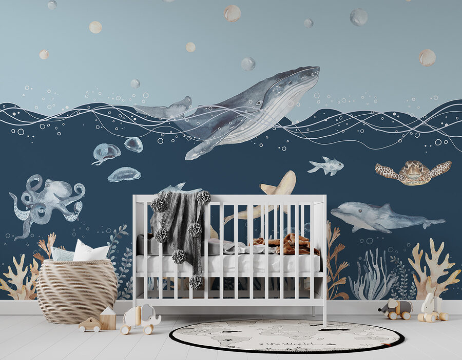 Imaginați-vă că vă transformați camera într-un tărâm al minunilor subacvatice cu pictura murală “Acuarela unei balene”. Este un amestec frumos de albastru senin și creaturi marine jucăușe, perfect pentru a adăuga o notă de magie oricărui spațiu. Fie că este vorba de camera unui copil, de o cameră pentru copii sau doar pentru că iubești oceanul, această pictură murală te acoperă.