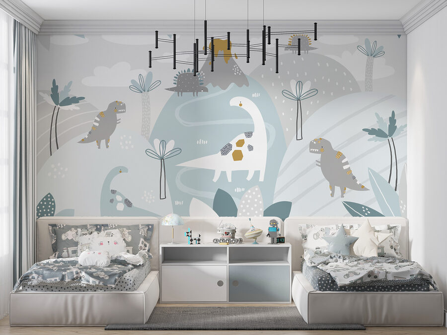 Îți poți imagina? Fiecare zi este o mini călătorie în Jurassic, chiar din dormitorul lor. Nu este doar decor; este o operă de artă strălucitoare care transformă pereții în minuni sălbatice.