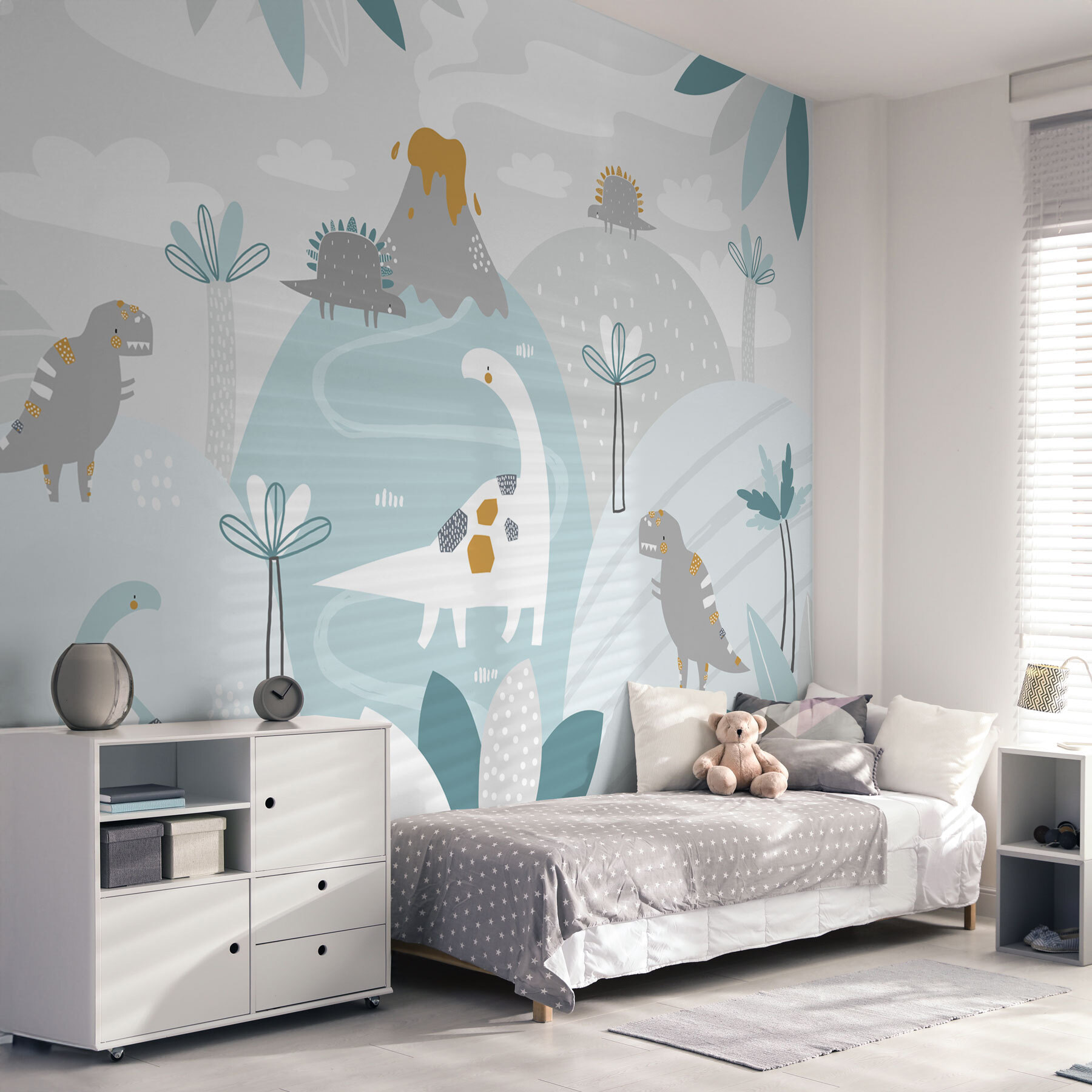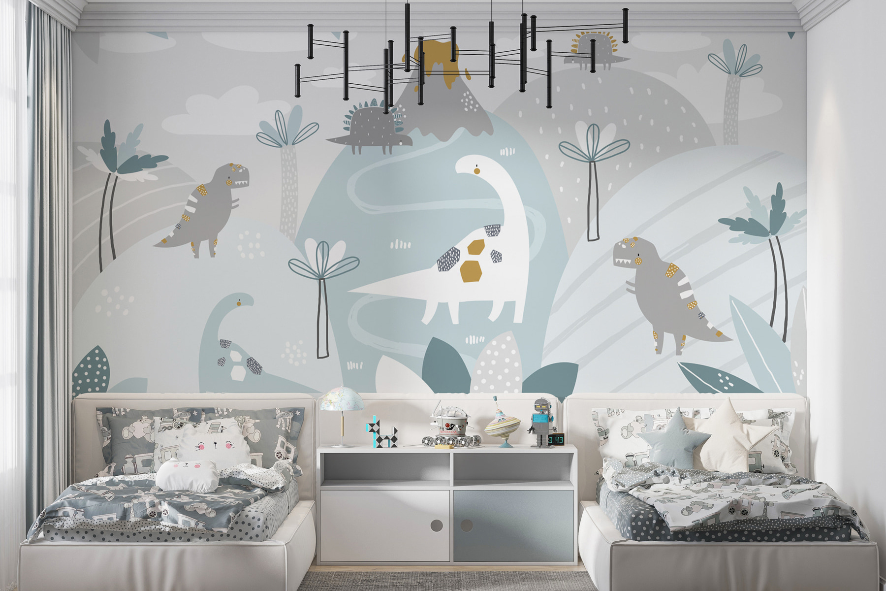 Îți poți imagina? Fiecare zi este o mini călătorie în Jurassic, chiar din dormitorul lor. Nu este doar decor; este o operă de artă strălucitoare care transformă pereții în minuni sălbatice.