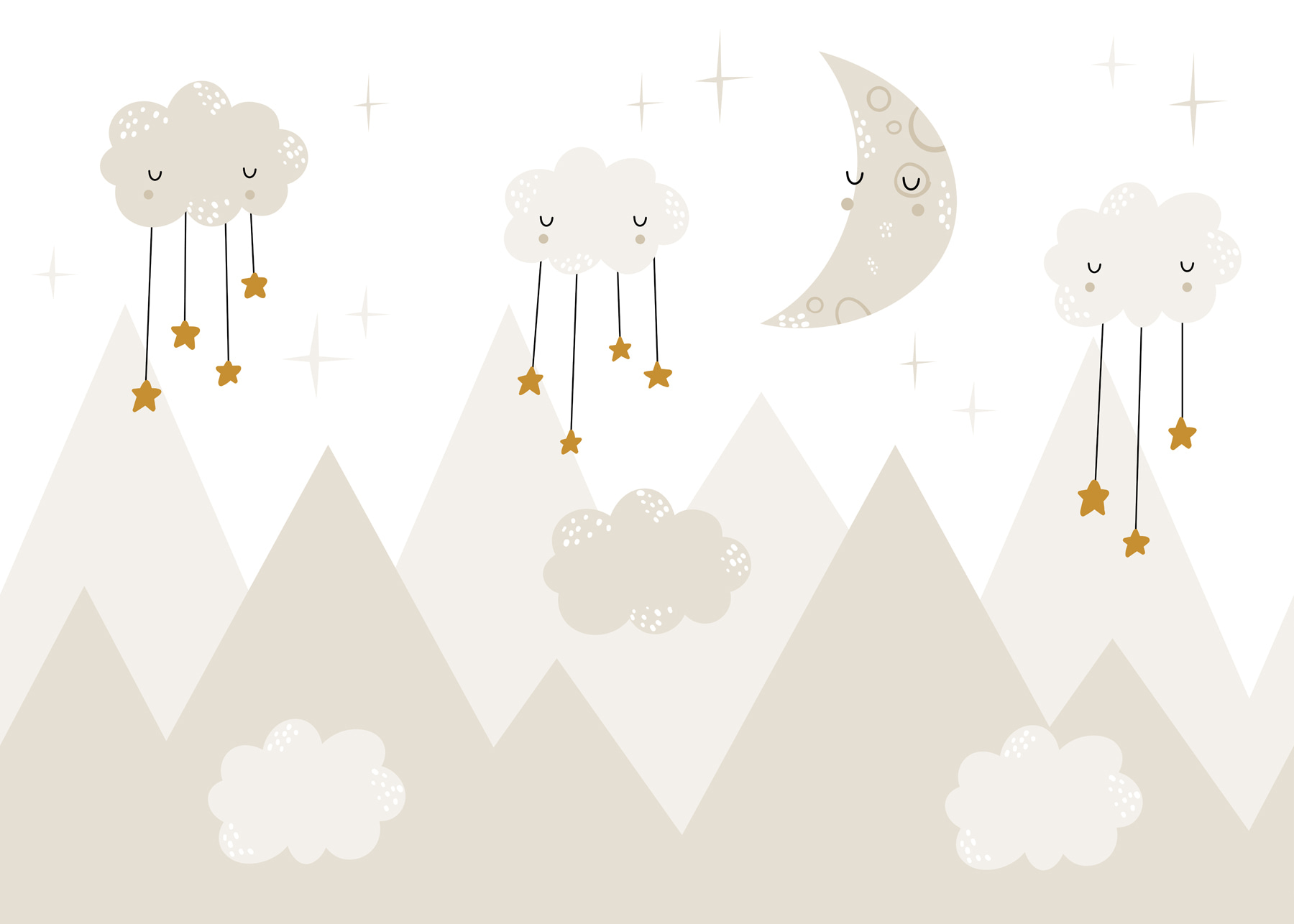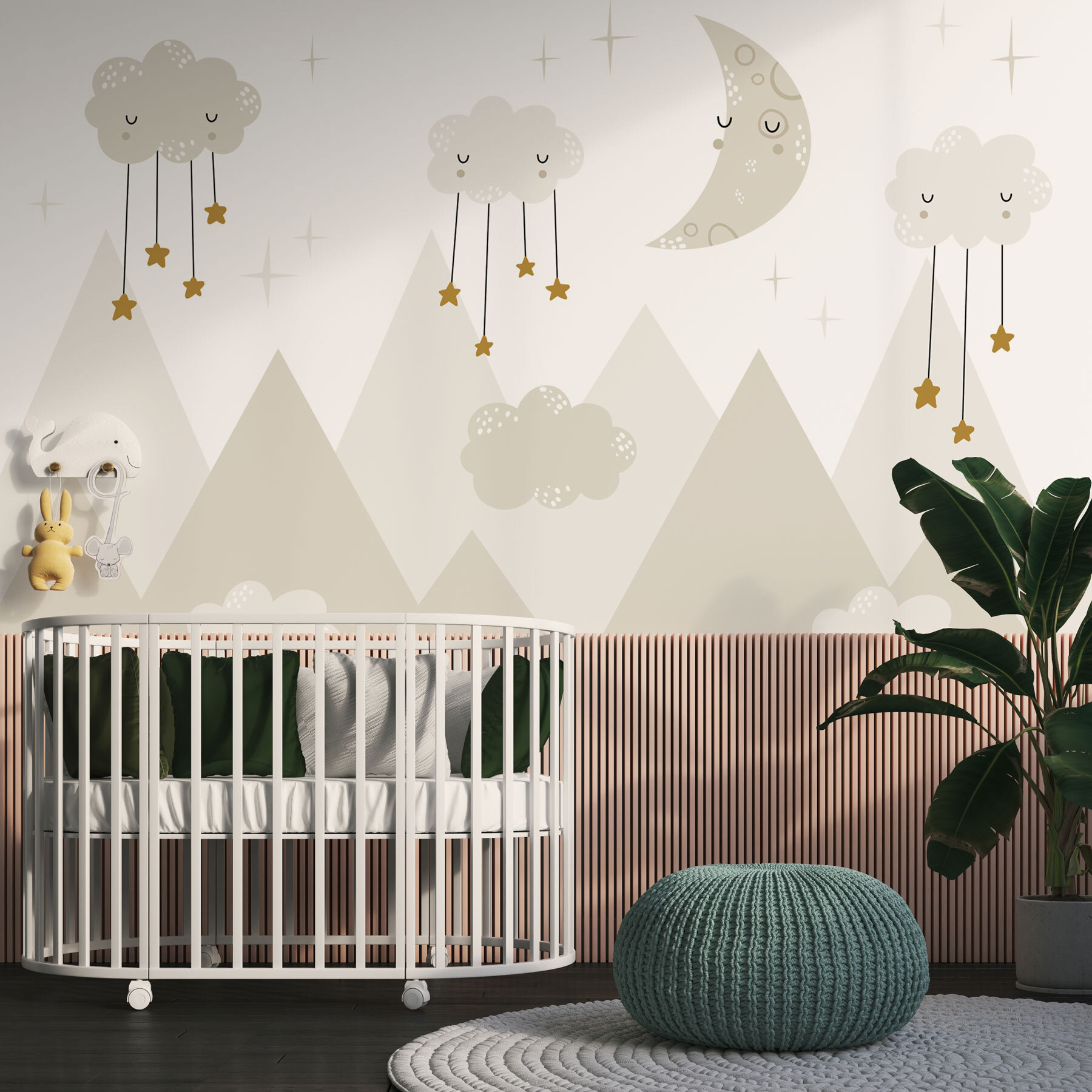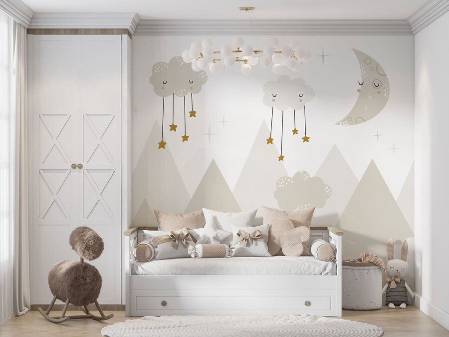 Imaginează-ți asta: o pictură murală de vis pe cerul de noapte, cu o lună somnoroasă și nori confortabili agățați de stele, strălucind ușor deasupra vârfurilor munților. Este ca și cum ai păși într-o poveste capricioasă înainte de culcare! Perfectă pentru o cameră de copii, această pictură murală îmbină imaginația și confortul – stârnind creativitatea celui mic și creând în același timp o ambianță liniștitoare. Gândiți-vă la toate visele dulci și la chicotelile de la culcare. În plus, cui nu i-ar plăcea să adoarmă sub o astfel de scenă încântătoare și liniștitoare? Este mai mult decât un simplu decor – este o mică aventură, chiar pe perete.