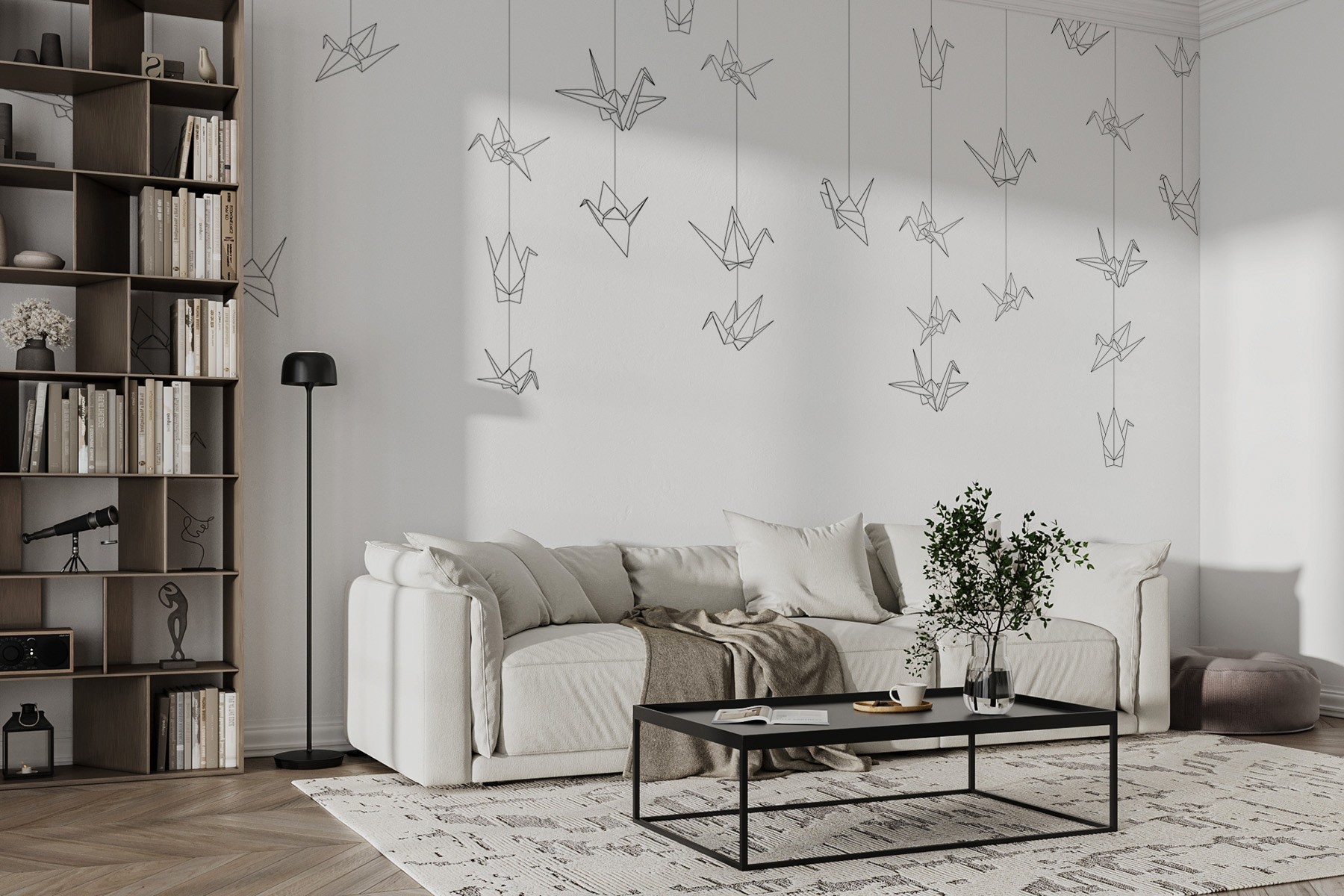 V-ați gândit vreodată să aduceți o notă artistică pereților dvs. cu un efort minim? Priviți această pictură murală cu păsări în alb și negru. Este ca și cum ai avea o bucată din caietul tău de schițe preferat mărită la dimensiune naturală. Liniile simple îi dau un aer elegant și modern. Imaginați-vă-o în camera de zi sau în spațiul de lucru – genul de piesă care vă face să respirați un minut și să vă relaxați. În plus, există ceva foarte liniștitor în legătură cu cocorii de hârtie care atârnă ușor, aproape ca și cum ar zbura. Este mixul perfect de artistic și zen. Dacă aveți o pasiune pentru decorul unic care stârnește bucurie (da, un moment Marie Kondo), această pictură murală vă cheamă.