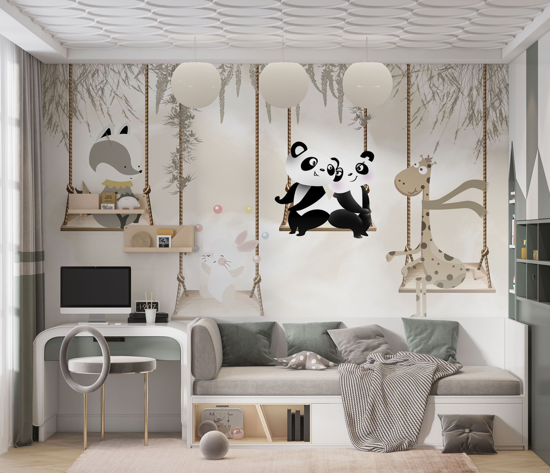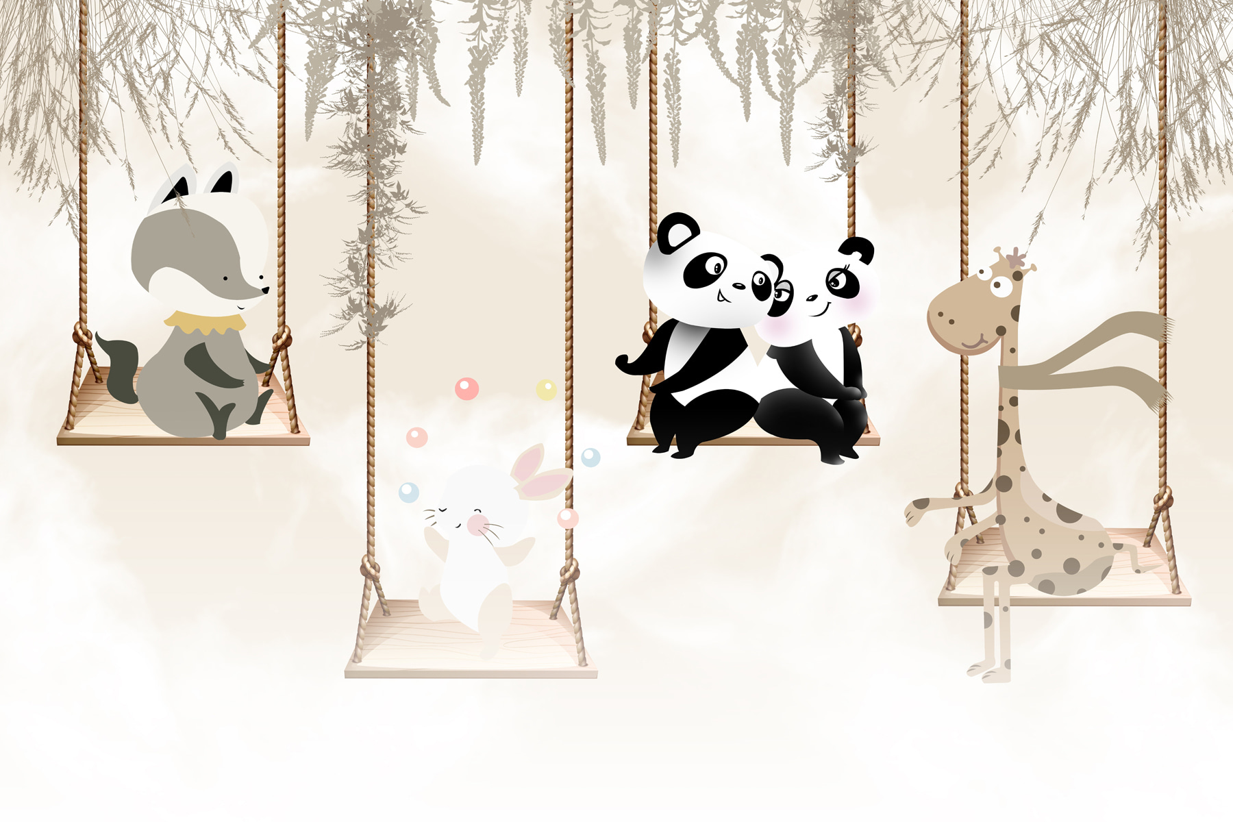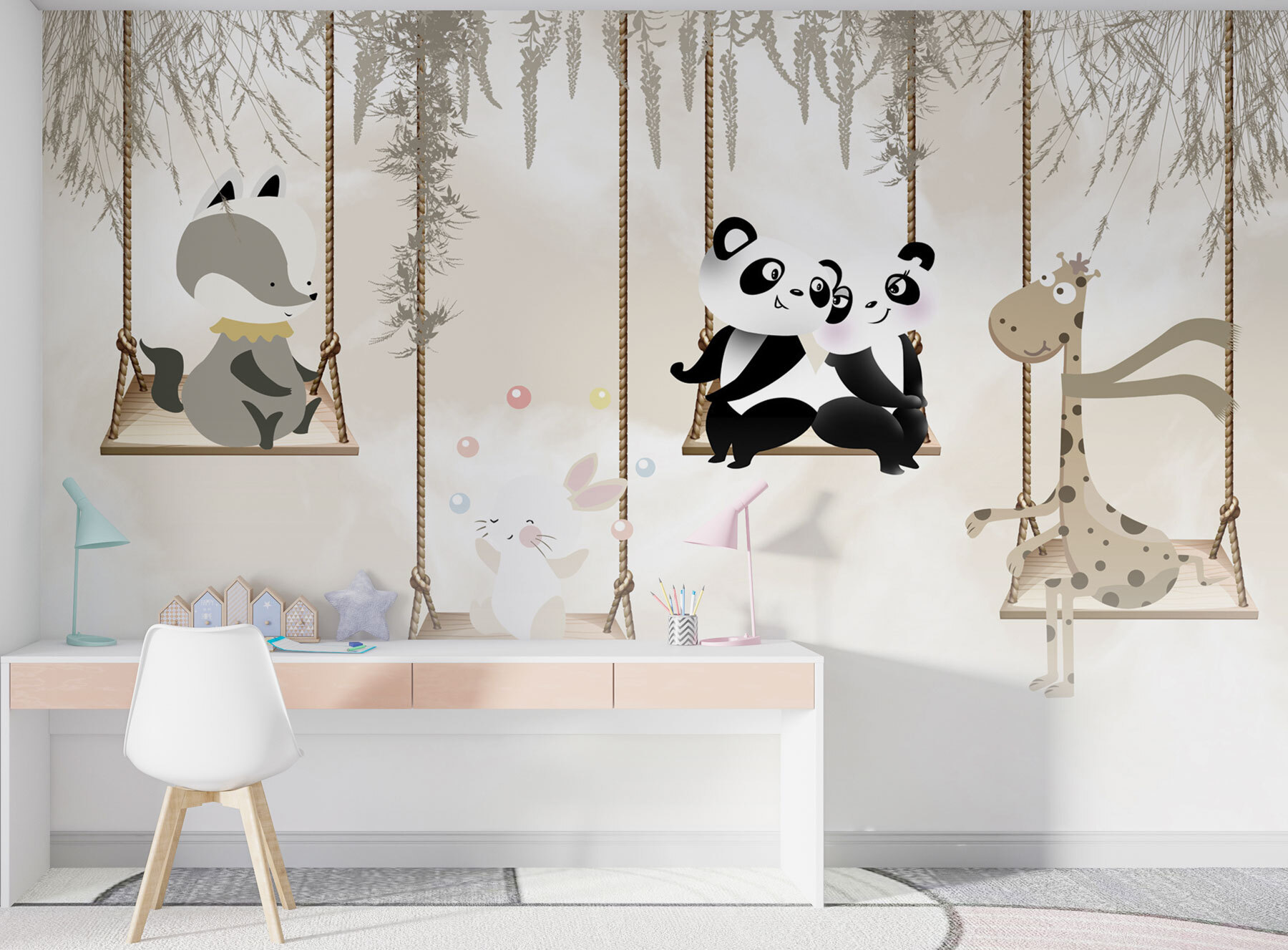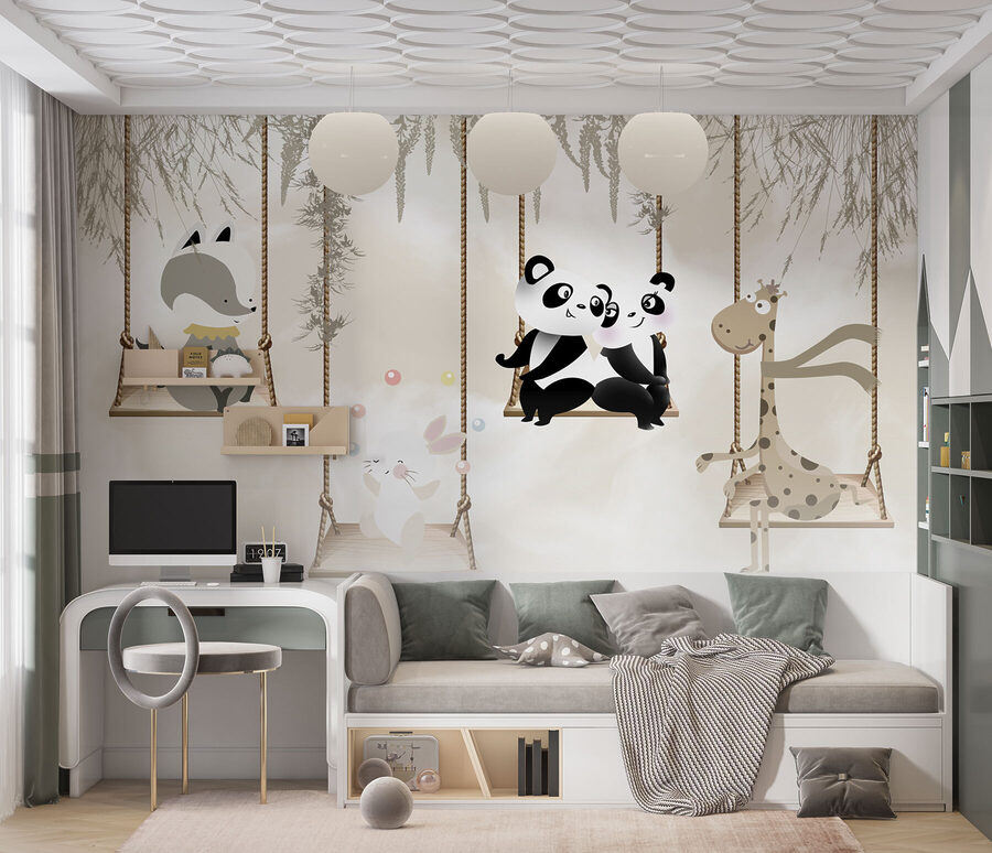 Nu reușiți să găsiți atingerea perfectă pentru camera celui mic? Imaginați-vă acest lucru: doi panda adorabili, legănându-se ușor unul lângă celălalt, aducând o atmosferă confortabilă și capricioasă spațiului. Această pictură murală, “Couple Pandas Sitting on a Swing”, îndeplinește toate condițiile – drăguță, fermecătoare și doar un pic înduioșătoare. Imaginați-vă că vă așezați copilul în pătuțul sau în patul lui, unde va adormi visând aventuri în pădure cu noii săi prieteni panda. Nu este doar o decorațiune; este o mini evadare într-o lume a mângâierilor și a distracției. Oh, și funcționează de minune și pentru camerele de joacă! Pregătește-te pentru câteva “awws” în plus la culcare.
