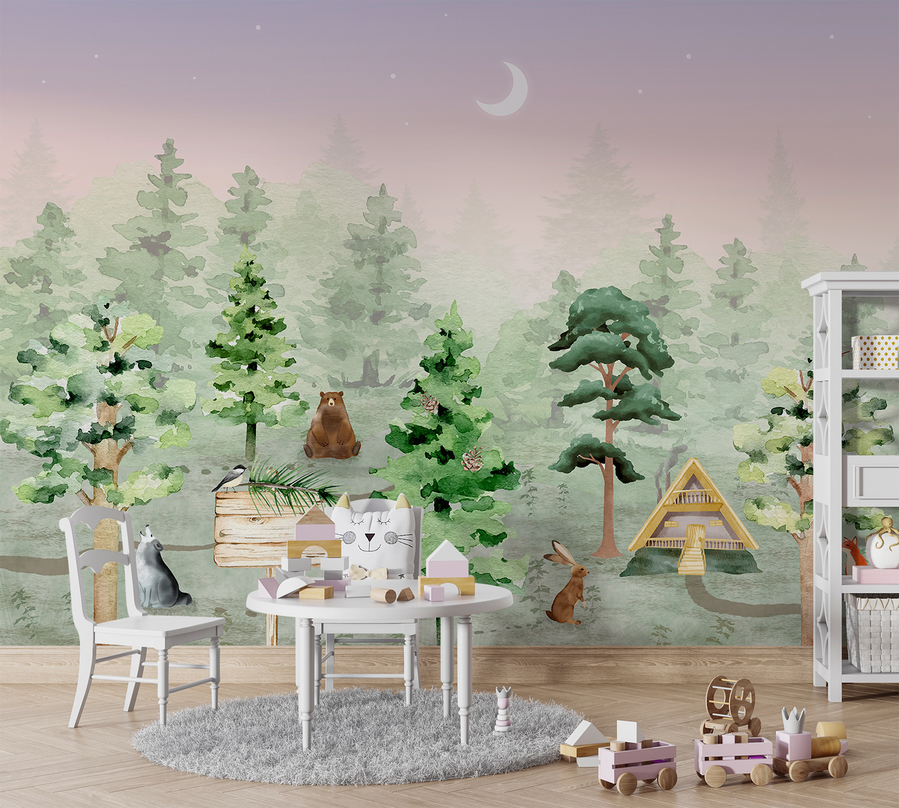 Imaginați-vă o pădure magică chiar în casa dvs. – această frumoasă pictură murală de perete prezintă o pasăre drăguță cocoțată pe un semn de lemn, invitându-vă într-o scenă capricioasă din pădure. Prietenii animalelor se adună în jur, fiecare adăugând o notă de farmec și aventură. Perfect pentru camerele copiilor, este ca și cum ai păși în fiecare zi într-o carte de povești îndrăgită. Culorile blânde și liniștitoare fac ca animalele să se simtă ca niște tovarăși prietenoși. Copiilor le va plăcea să vadă vulpea, iepurele și bătrânul urs înțelept în timp ce adorm. Lumina lunii adaugă o notă de încântare, făcând ora de culcare un pic mai magică. Nu este doar o pictură murală, este o călătorie într-o pădure de vis care stârnește imaginația și dragostea pentru natură în inimile tinerilor. Cine nu și-ar dori această bucățică de minune pe peretele său?