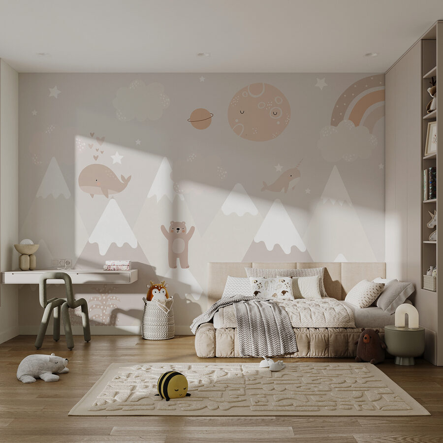 Această încântătoare pictură murală “Balenă desenată cu stele” este ca și cum ai păși într-un vis capricios! Perfectă pentru camera unui copil, camera copilului sau orice spațiu jucăuș, aceasta aduce o atmosferă confortabilă și magică, care este atât liniștitoare, cât și distractivă. Imaginați-vă-i pe cei mici adormind sub o lună zâmbitoare, cu balene prietenoase și narvale plutind printre stele – magie pură a poveștii de culcare! Tonurile pastelate moi și personajele dulci creează o atmosferă senină și primitoare, fiind un fundal minunat pentru momentele de îmbrățișare sau pentru întâlnirile de joacă. Îmbrățișați farmecul și lăsați această scenă încântătoare să stârnească bucurie și creativitate în spațiul dumneavoastră!