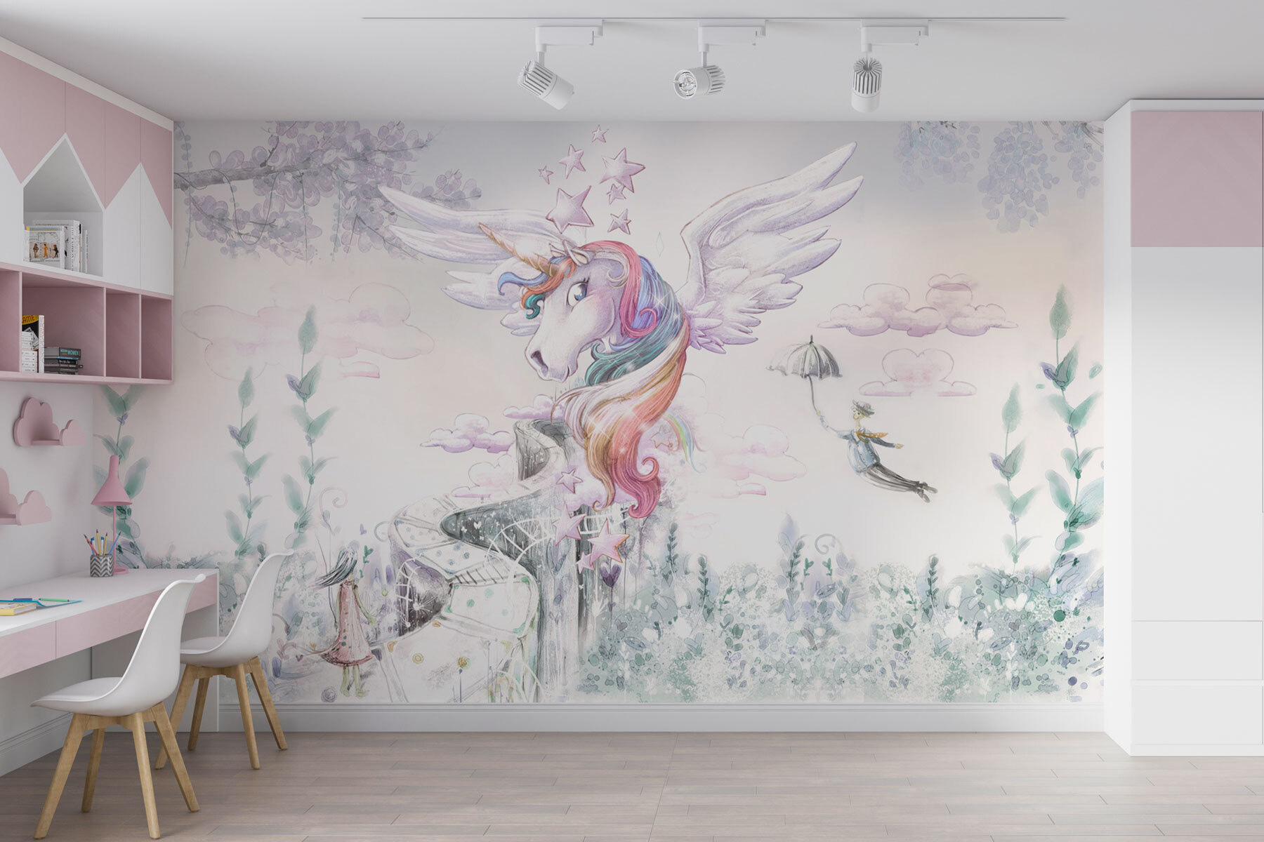 Căutați un strop de magie în camera copilului dumneavoastră? Uitați-vă la această pictură murală “Unicorn cu aripi și păr curcubeu”! Imaginați-vă că vă treziți într-o scenă desprinsă din basme – un unicorn capricios cu păr curcubeu pastel, înconjurat de nori moi și stele strălucitoare. Este ca visul oricărui copil, pictat pe peretele său! Această pictură murală se potrivește de minune în grădinițe și în camerele copiilor mici, făcându-i să se simtă ca și cum ar fi sărit în cartea lor de povești preferată. Dulce și discret, dar total încântător – stârnește bucurie și povești nesfârșite. Perfect pentru țara minunilor unui micuț sau pentru paradisul oricărui iubitor de unicorni! 🌈🦄