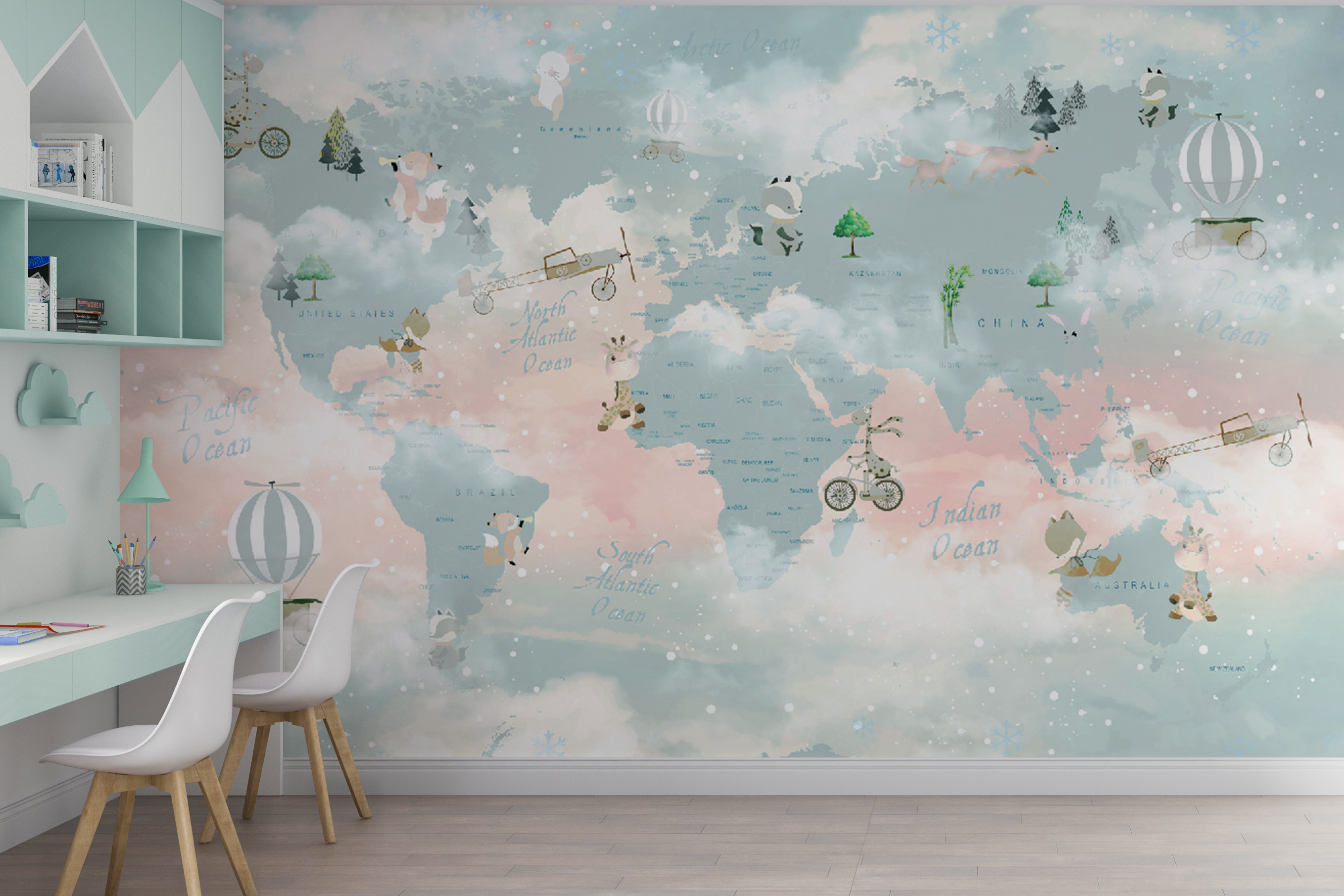 Acest mural “Harta lumii cu nori și animale” nu este un decor de perete obișnuit – este o aventură capricioasă care așteaptă să se desfășoare! Perfectă pentru micii exploratori și visători, aceasta prezintă o hartă în culori pastelate cu ilustrații fermecătoare cu animale și nori pufoși. Imaginați-vă că bebelușul sau copilul dvs. privește această hartă murală și pornește într-o călătorie imaginară din America de Nord până în Africa, având drept tovarăși de călătorie animăluțe curioase.