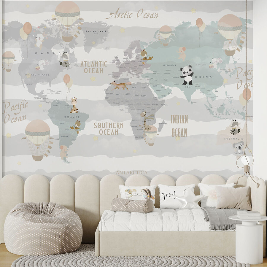 Această adorabilă pictură murală “Balon cu aer cald pe cer” va purta imaginația copilului dvs. într-o aventură magică. Imaginați-vă o hartă a lumii, frumos moale și pastelată, acoperită cu cele mai drăguțe creaturi în baloane cu aer cald – există chiar și un panda jucăuș și o girafă curioasă! Este ca un safari global chiar pe perete. Perfectă pentru o cameră de copil sau pentru o cameră de copil jucăușă, această pictură murală încurajează mirarea cu privire la lumea mare și largă. Este garantat că va inspira povești înainte de culcare despre zborul deasupra oceanelor strălucitoare și aterizarea în ținuturi îndepărtate. Ideală pentru micii exploratori – părinții s-ar putea surprinde și ei visând cu ochii deschiși. Este confortabilă, capricioasă și plină de farmec – exact ceea ce are nevoie spațiul fiecărui copil!