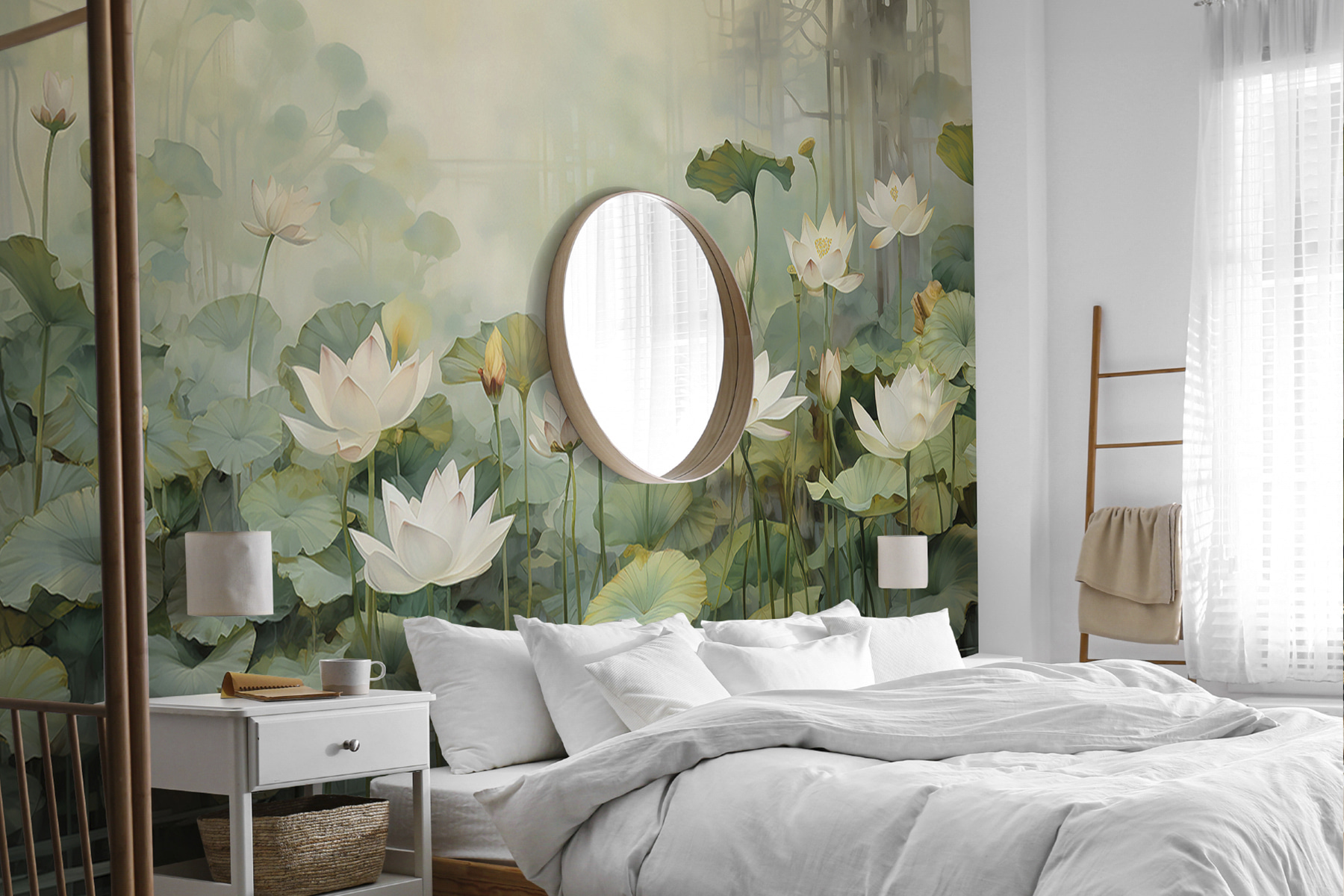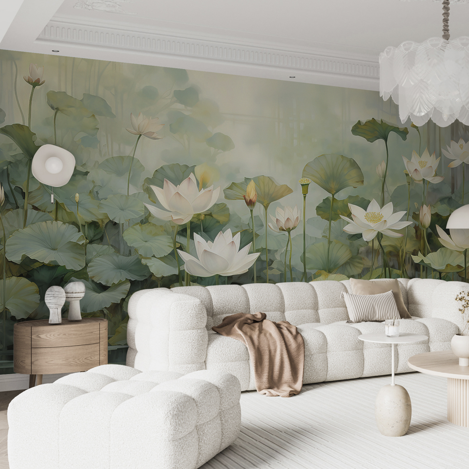 Imaginați-vă că pășiți într-un sanctuar senin cu această pictură murală încântătoare a unui iaz liniștit, presărat cu flori delicate și înconjurat de verdeață luxuriantă. Este ca și cum ai aduce un refugiu liniștit chiar în casa ta. Nuanțele blânde vă invită să vă opriți și să respirați, evocând senzația după-amiezelor leneșe pe malul unui lac liniștit. Imaginați-vă o ceașcă de ceai și o carte bună în mână, pierduți în frumusețea naturii fără să părăsiți vreodată camera. Ideală pentru un spațiu de locuit confortabil sau un colț de lectură liniștit, această pictură murală șoptește relaxare și o notă de fantezie, făcând orice perete să se simtă ca o fereastră spre o grădină magică.