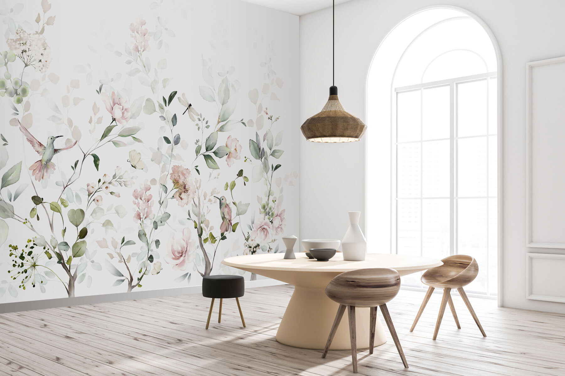 Imaginați-vă acest lucru: vă sorbiți cafeaua de dimineață, bucurându-vă de lumina blândă a soarelui care pătrunde prin fereastră – acum înconjurați-vă cu această uimitoare pictură murală “Colibri printre modele florale delicate”. Este ca și cum ai păși într-o grădină capricioasă chiar în sufrageria ta! Aceste păsări, cu penele lor vibrante și aripile lor mici și zburătoare, aduc un sentiment de bucurie și seninătate în orice spațiu. Florile moi, pastelate și frunzișul verde luxuriant dețin o magie liniștită, aproape ca și cum ar șopti secrete din natură. Perfect pentru oricine iubește natura, frumusețea și un pic de fantezie în decorul său. Această pictură murală vă va transforma spațiul într-o oază liniștită și aerisită, unde puteți scăpa de agitația vieții de zi cu zi. Un amestec minunat de pace și frumusețe – este practic ca o terapie, pe peretele tău.