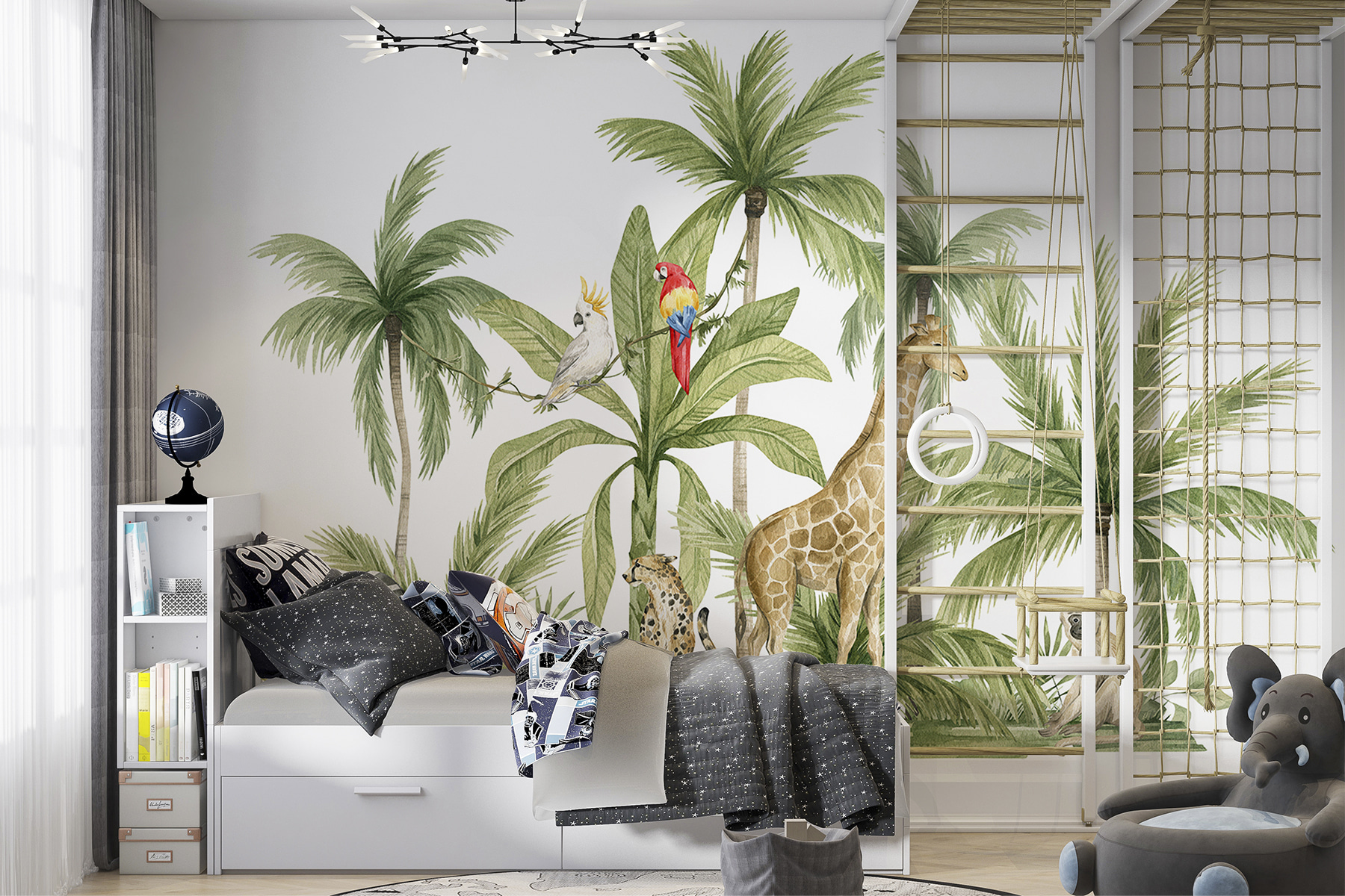 Copiii ar adora-o, visând la povești despre împrietenirea cu animalele din junglă. De asemenea, este fabulos pentru a crea o atmosferă jucăușă, capricioasă, fără a fi prea mult. Chiar și adulții ar putea să o găsească relaxantă, ca o mini-excursie într-un paradis tropical chiar la ei acasă. Tonurile blânde, pământii, combinate cu detaliile vii aduc echilibrul potrivit de liniște și vivacitate.