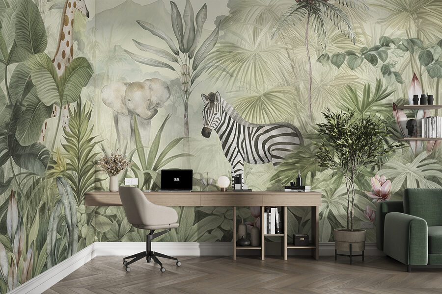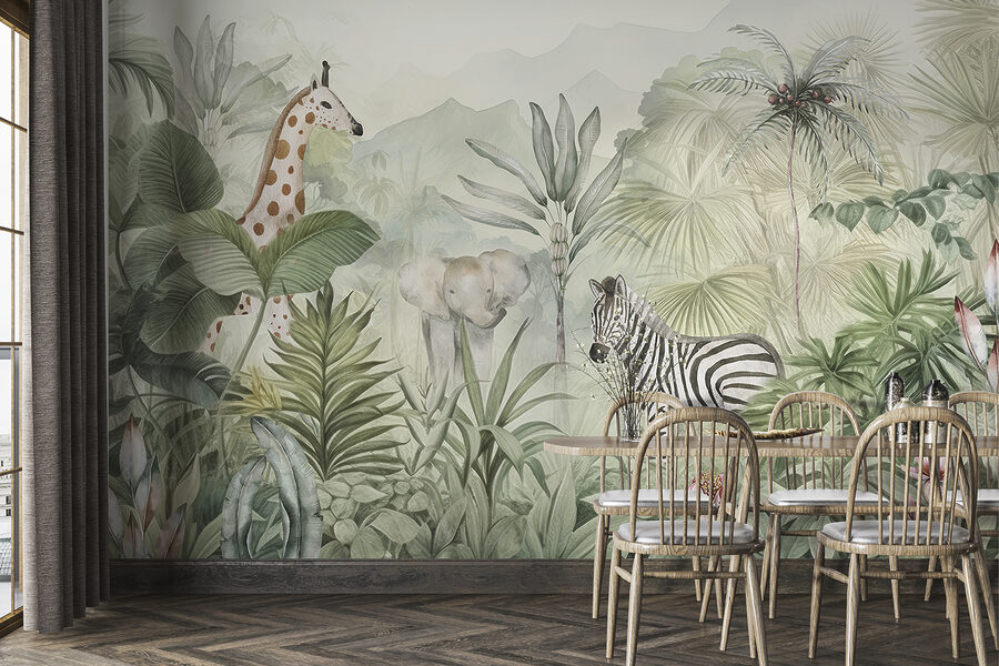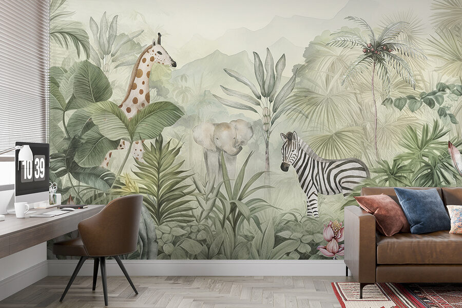 Imaginați-vă că pășiți într-o junglă plină de viață – dar în propria dvs. cameră! Această pictură murală “Animals Roam Tranquil Jungle Landscape” este magie pură pentru ochi. Elefanți, zebre și girafe se plimbă pașnic prin această verdeață luxuriantă care este atât de vibrantă, încât aproape veți simți umiditatea! Ideală pentru copii și sugari, este un amestec liniștitor de aventură și seninătate, care stârnește cele mai sălbatice imaginații. Pastelurile moi și detaliile complicate o fac să se remarce în orice spațiu. Perfect pentru iubitorii de natură sau pentru cei care doresc doar să evadeze – fără a părăsi casa.