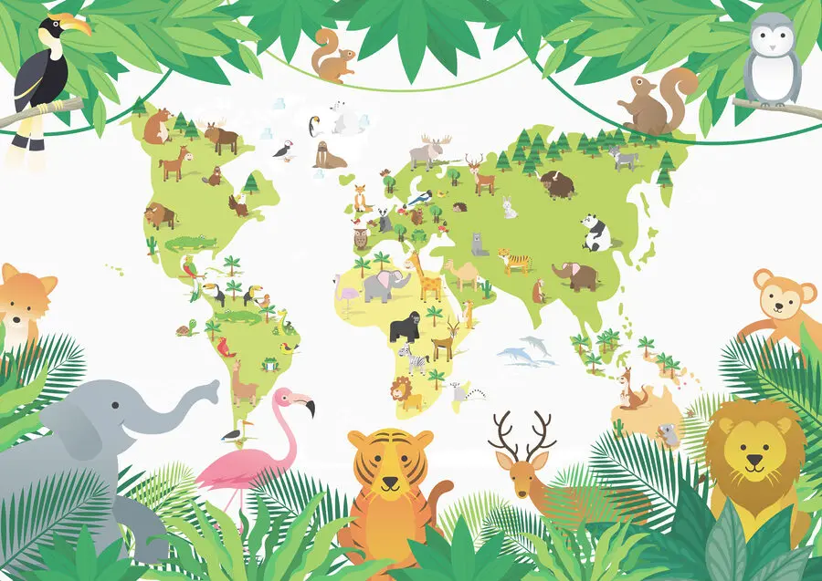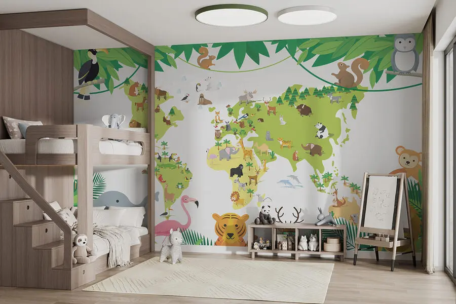 Aveți mai mulți copii sau o cameră de joacă care trebuie modernizată? Această pictură murală se potrivește perfect – este ca o operă de artă care spune o poveste. Imaginați-vă fețele lor luminându-se pe măsură ce descoperă toate creaturile drăguțe ascunse în frunze sau cartografiate pe continente.