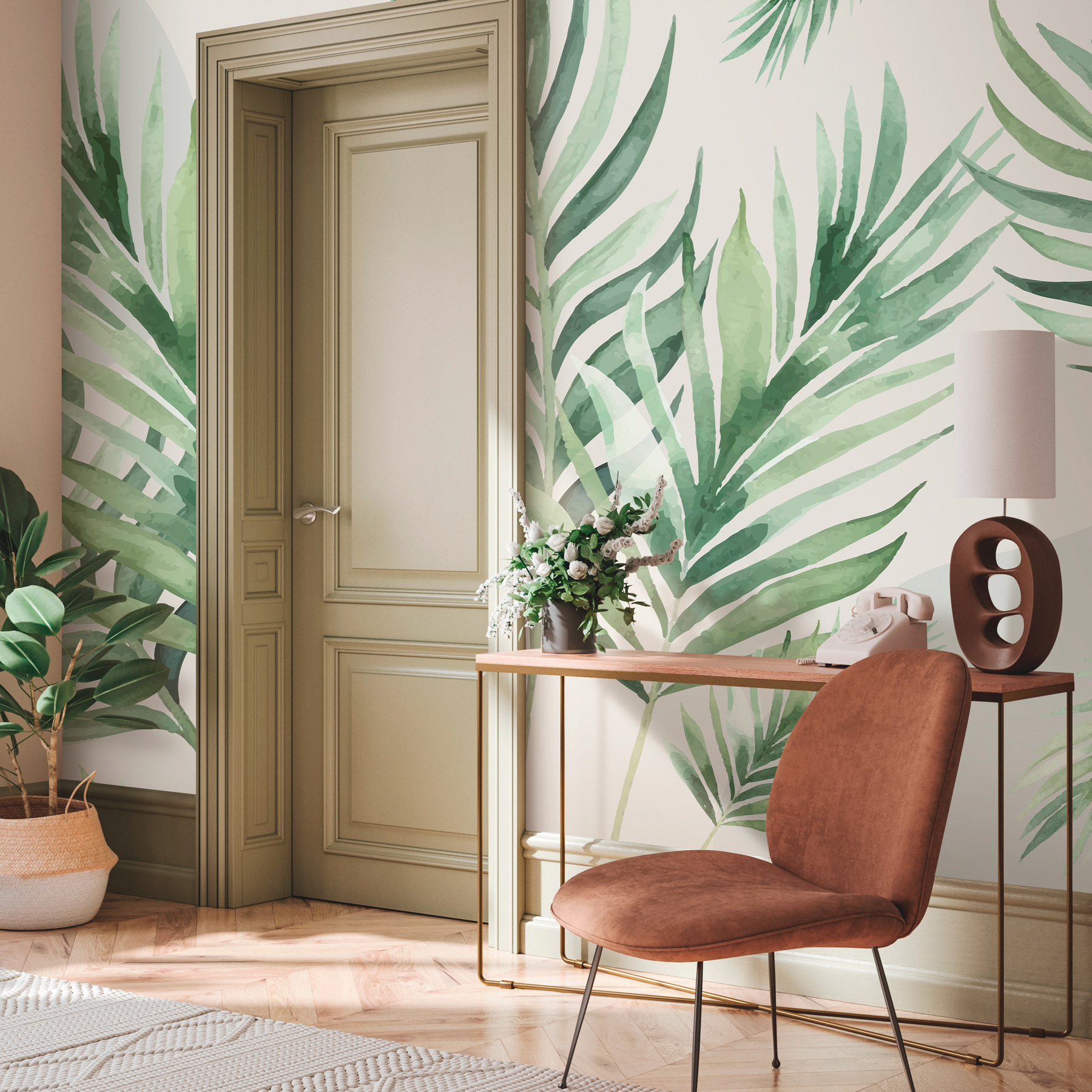 Transformați orice spațiu într-un refugiu tropical cu această pictură murală încântătoare de frunze moi în acuarelă. Imaginați-vă că vă treziți în fiecare dimineață cu legănarea blândă a frunzelor de palmier dansând pe pereții dvs., ca și cum ați fi în vacanță într-o stațiune liniștită de pe malul mării. Verdele subtil invită la un sentiment de calm, luminând fără efort casa ta – nu este nevoie de protecție solară! Imaginați-vă un colț de lectură confortabil în care vă sorbiți cafeaua în timp ce priviți acest peisaj luxuriant. Este ca și cum ați aduce un pic din junglă în casă, fără țânțari. Perfect pentru cei care tânjesc după natură, dar cărora le place să stea în casă.