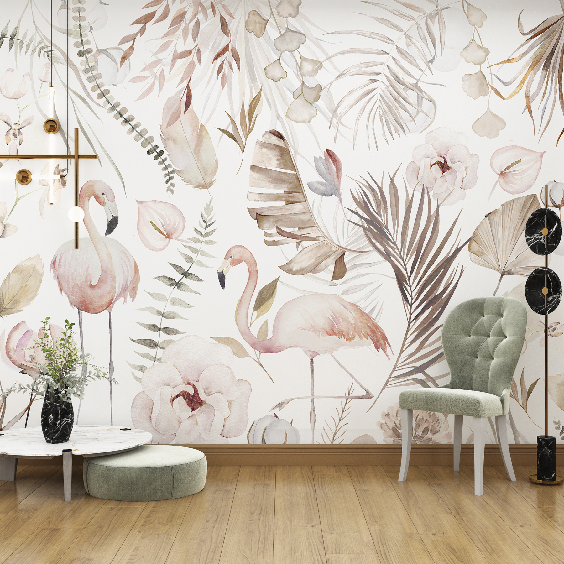 Imaginați-vă că oferiți spațiului dvs. o doză de paradis, cu “Flamingo Dance Amidst Botanical Dreams”. Această pictură murală vă transportă într-o junglă de vis, unde flamingo elegante întâlnesc o grădină luxuriantă cu floră exotică. Perfect pentru cei care adoră o atingere a tropicelor – este ca o mini-vacanță pe peretele dvs. Culorile blânde și designul capricios adaugă un vibe senin, dar jucăuș. S-ar putea chiar să vă treziți visând cu ochii deschiși la după-amiezele leneșe însorite de pe plajă. Serios vorbind, este o piesă care fură scena. Ideal pentru sufragerii, dormitoare sau orice colțișor care are nevoie de un strop de viață și culoare. Crede-mă, pereții tăi îți vor mulțumi!