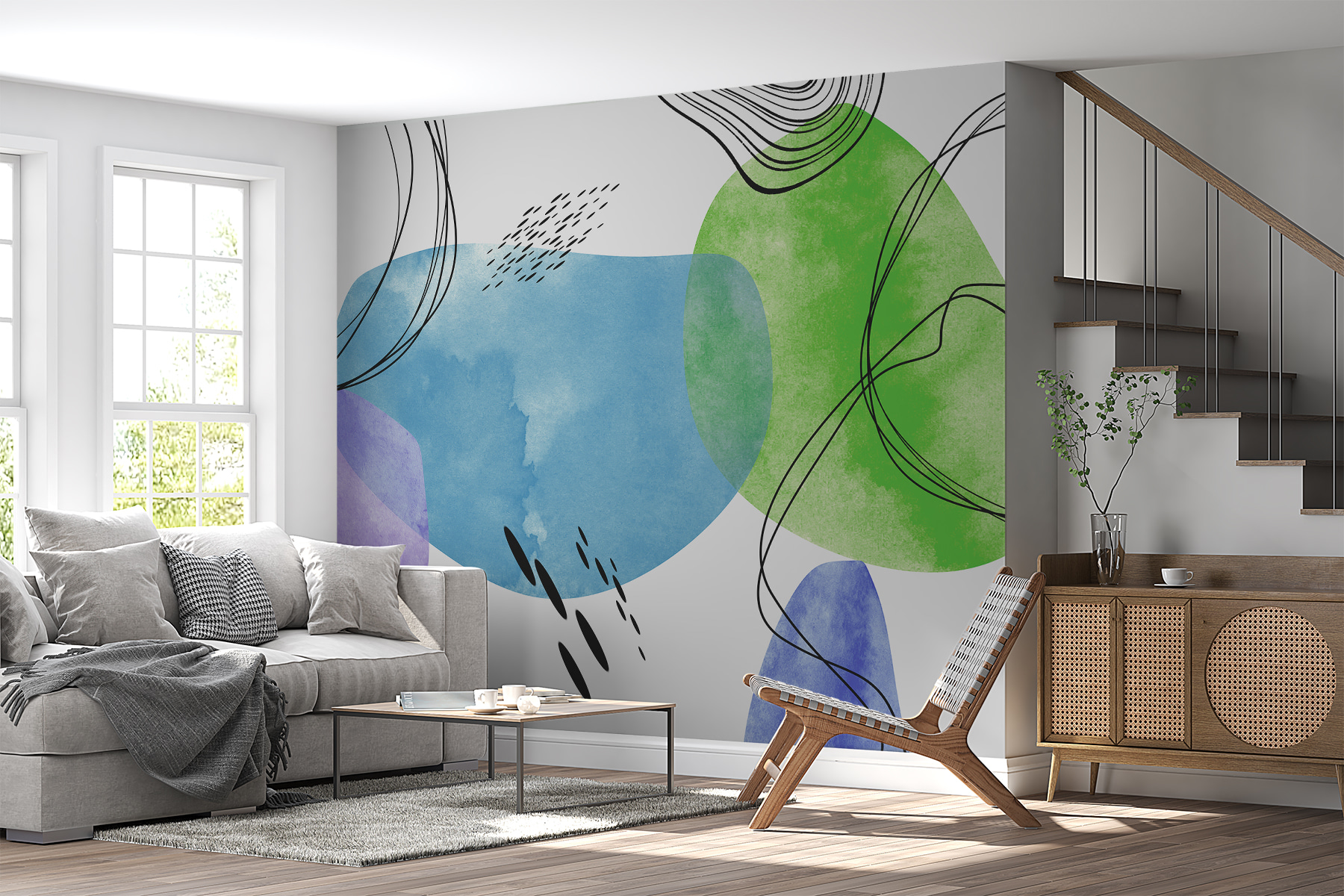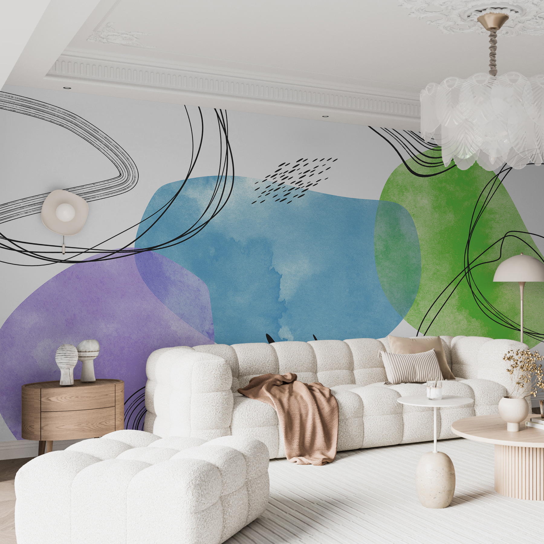 Este perfect pentru momentele în care vreți să stați pe spate, să vă relaxați și să vă pierdeți în gânduri. Culorile sunt liniștitoare, dându-ți acea senzație de “totul va fi bine”, dar există și această notă artistică cool, care face ca spațiul tău să fie foarte elegant, fără a încerca prea mult. Imaginează-ți că ai prieteni la tine și toți te întreabă: “Uau, de unde ai pictura asta murală?” Este un starter de conversație, un stimulent pentru starea de spirit și o operă de artă – toate la un loc.