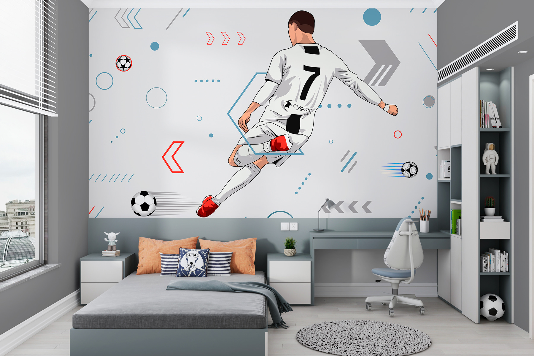 Imaginează-ți că intri în camera ta și ești întâmpinat de această pictură murală epică a unui jucător de fotbal care lovește o minge cu toată puterea. Aproape că puteți simți energia și pasiunea care sar de pe perete! Perfect pentru orice fan al fotbalului, fie că aveți un viitor Messi în devenire sau pe cineva care doar iubește jocul frumos. Cu linii dinamice și culori îndrăznețe, acest mural face o declarație – este ca și cum ai avea un mini stadion chiar în casa ta. Ideală pentru camera copilului, peștera omului sau chiar biroul dvs. dacă vă simțiți puțin aventuros. De fiecare dată când te uiți la el, îți vei imagina emoția jocului și poate chiar te vei simți puțin inspirat să îți începi ziua cu același spirit înflăcărat. Nu este doar o decorațiune, este o explozie de emoție pe peretele tău!