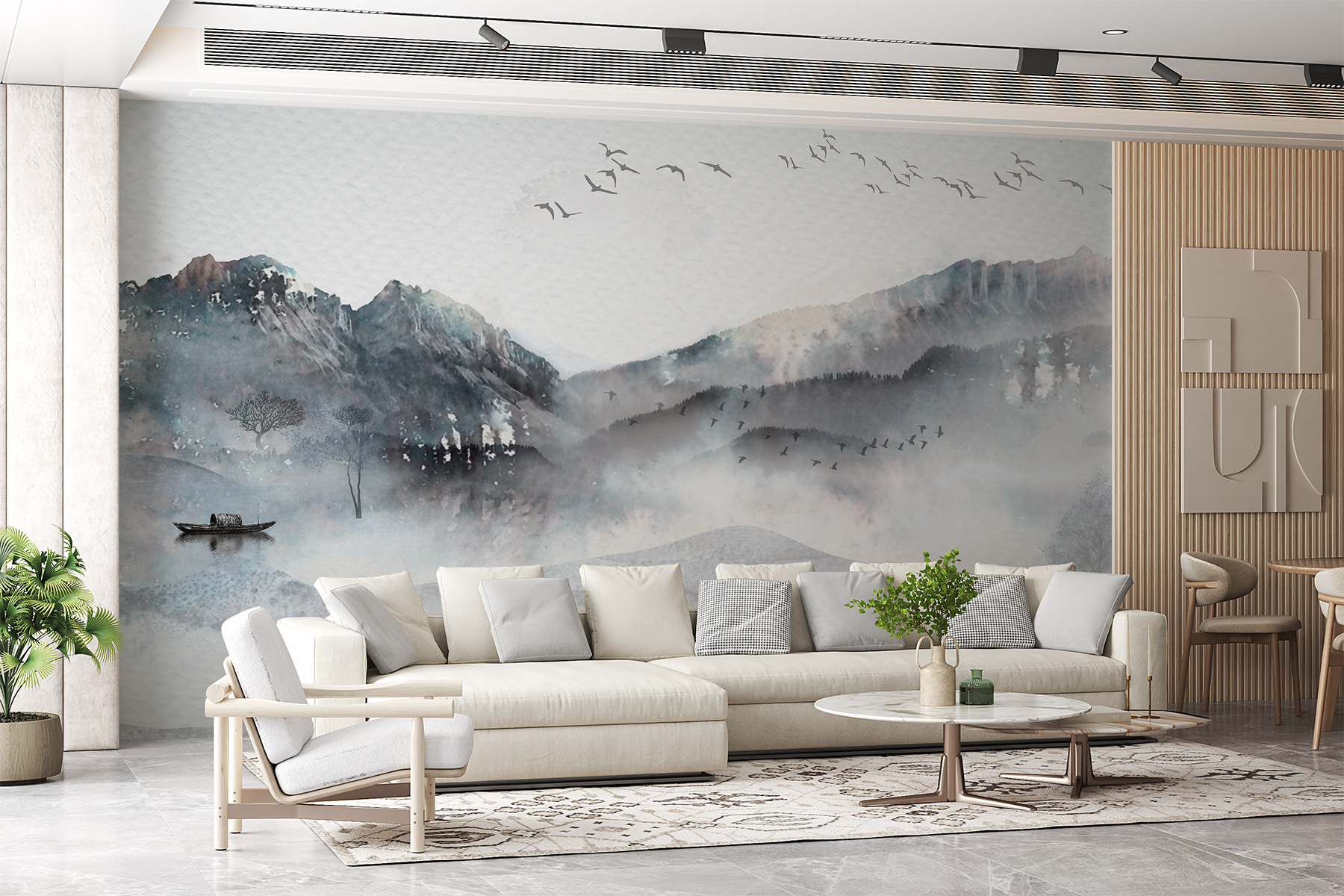 Imaginați-vă că intrați într-o cameră și sunteți întâmpinați de un grup senin de păsări care zboară pe un cer de vis, plutind în derivă deasupra unui peisaj forestier cețos. Această pictură murală în acuarelă nu este doar artă – este o experiență. Ceața liniștitoare, dealurile moi și munții îndepărtați – ca o șoaptă blândă a naturii. E ca și cum ai auzi șoapta copacilor și ai simți aerul răcoros și proaspăt de dimineață atingându-ți pielea.