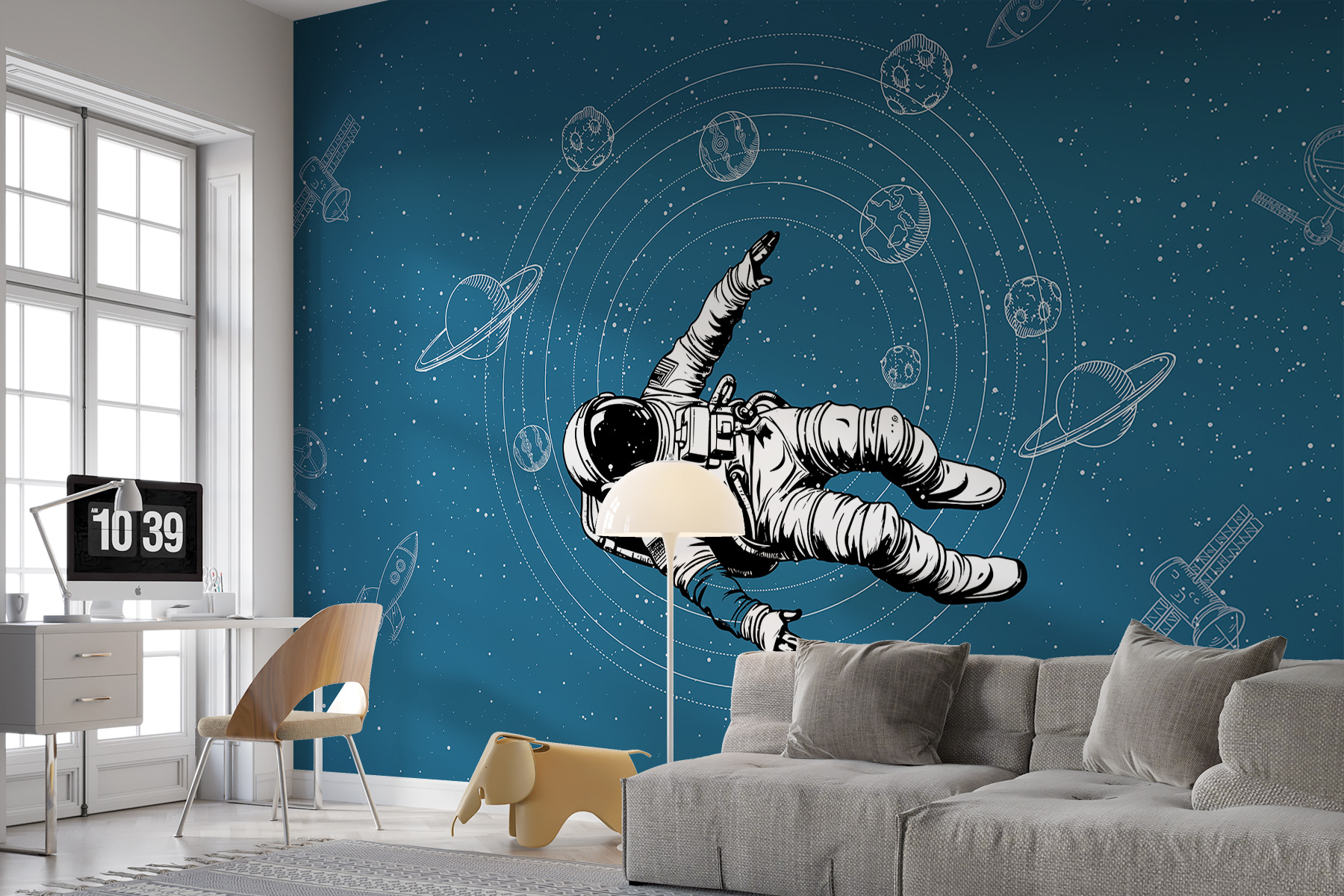 Condimentați-vă spațiul cu această pictură murală “Astronaut plutind în spațiu”, care face parte din colecția noastră de picturi murale Galaxy Fototapet. Imaginați-vă că plutiți în cosmos de fiecare dată când intrați în cameră. Fundalul albastru intens, presărat cu stele și planete, este perfect pentru a adăuga un sentiment de aventură și uimire pe orice perete. Fie că este vorba de camera unui copil în care visele de călătorie în spațiu prind viață sau de ascunzătoarea dvs. personală, această pictură murală aduce seninătate și o notă de magie. Imaginați-vă că faceți o pauză într-o zi agitată și plutiți, fără greutate, printre galaxii. Evadare pură, chiar pe peretele tău!