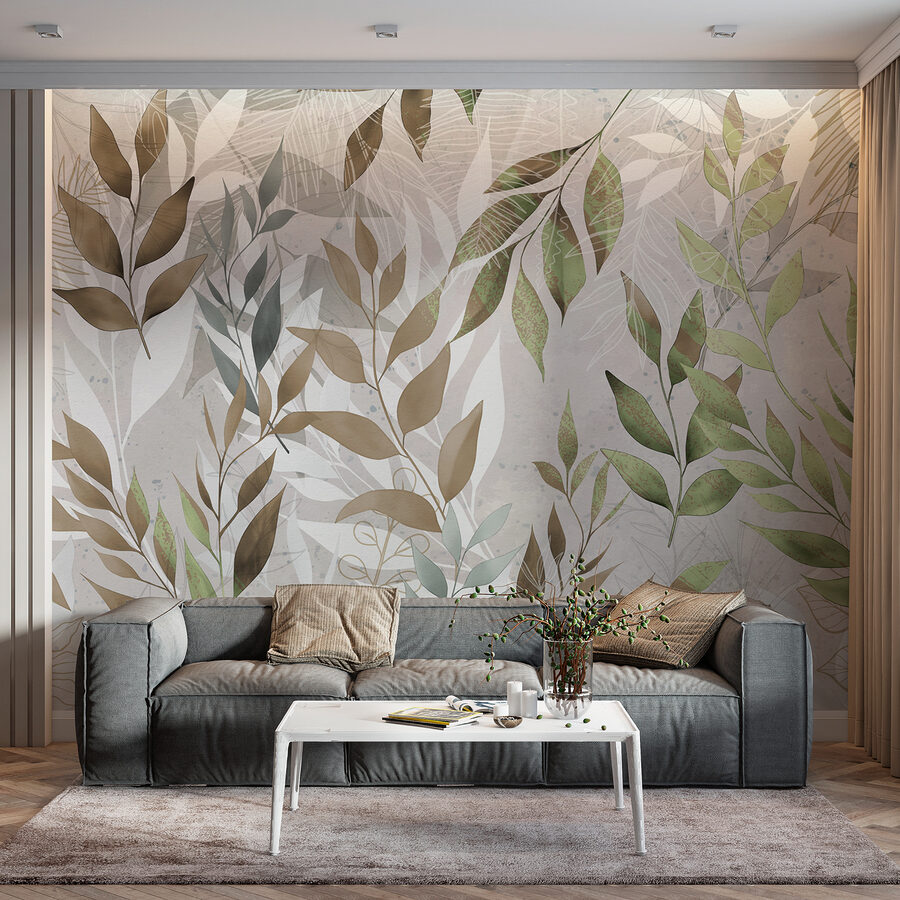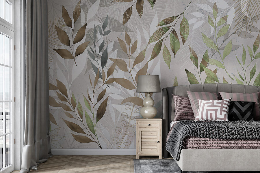 Culorile sunt verzi și maronii moi, dar vii, amestecate perfect pentru a oferi acel aspect cool fără efort. De fiecare dată când vă uitați la ea, s-ar putea să vă simțiți puțin mai relaxat, ca și cum ați lua o mini-vacanță. Ideală pentru cei care iubesc frumusețea naturii, dar nu pot fi mereu afară. Această pictură murală nu doar decorează, ci creează o experiență – imaginați-vă dimineți confortabile cu cafea sau seri cu muzică ușoară, înconjurați de această minunată operă de artă cu frunze. Perfect pentru visare.
