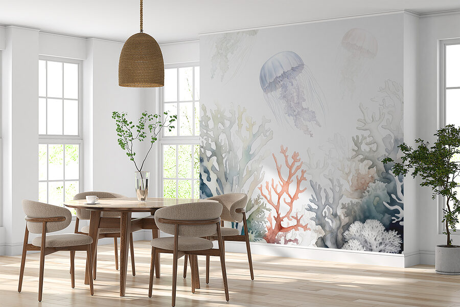 Imaginați-vă înotând printr-un tărâm al minunilor subacvatic liniștit. Acesta este genul de vibrație pe care această pictură murală “Meduze plutind în derivă peste corali colorați” o aduce în spațiul tău. Este ca o șoaptă a oceanului pe pereții dvs.! Nuanțele moi, de acuarelă, te fac să te simți relaxat – aproape că poți auzi legănarea blândă a mării. Perfectă pentru oricine iubește farmecul de la malul mării, este un adevărat starter de conversație. Așezați-vă în această scenă senină și lăsați-vă grijile să dispară cu aceste meduze superbe. Un strop de culoare și liniște în casa ta!