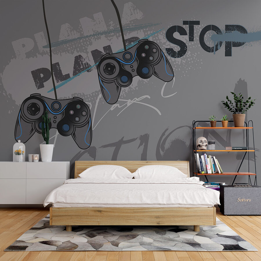 Transformați orice cameră într-un paradis vibrant al jocurilor cu această pictură murală cu controlere de jocuri video îndrăznețe pe un fundal gri elegant. Nu este doar un design; este o chemare la acțiune pentru toate acele sesiuni de jocuri nocturne și victorii epice. Imaginați-vă acest lucru: un spațiu confortabil în care se adună prietenii, gustări la îndemână, râsete în aer și ochii lipiți de ecran – acest mural dă tonul perfect. Arta jucăușă “PLAN” și “STOP” îmbină distracția și energia, amintindu-le tuturor că fiecare moment contează, atât în joc, cât și în afara lui. Este ideal pentru o cameră de jocuri, dormitorul unui tânăr jucător sau chiar un spațiu de locuit distractiv. Deci, de ce să nu îmbrățișați spiritul gamer?