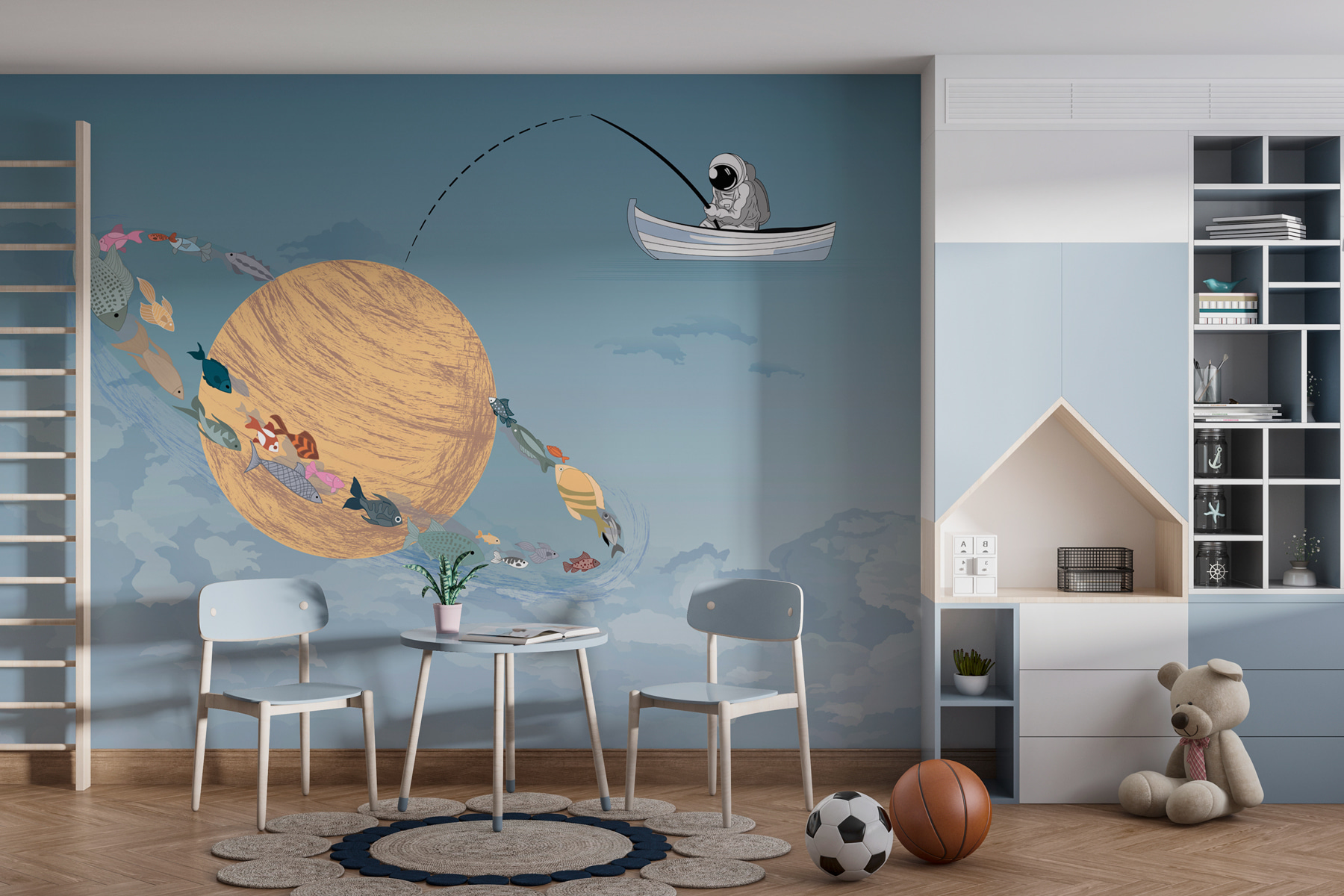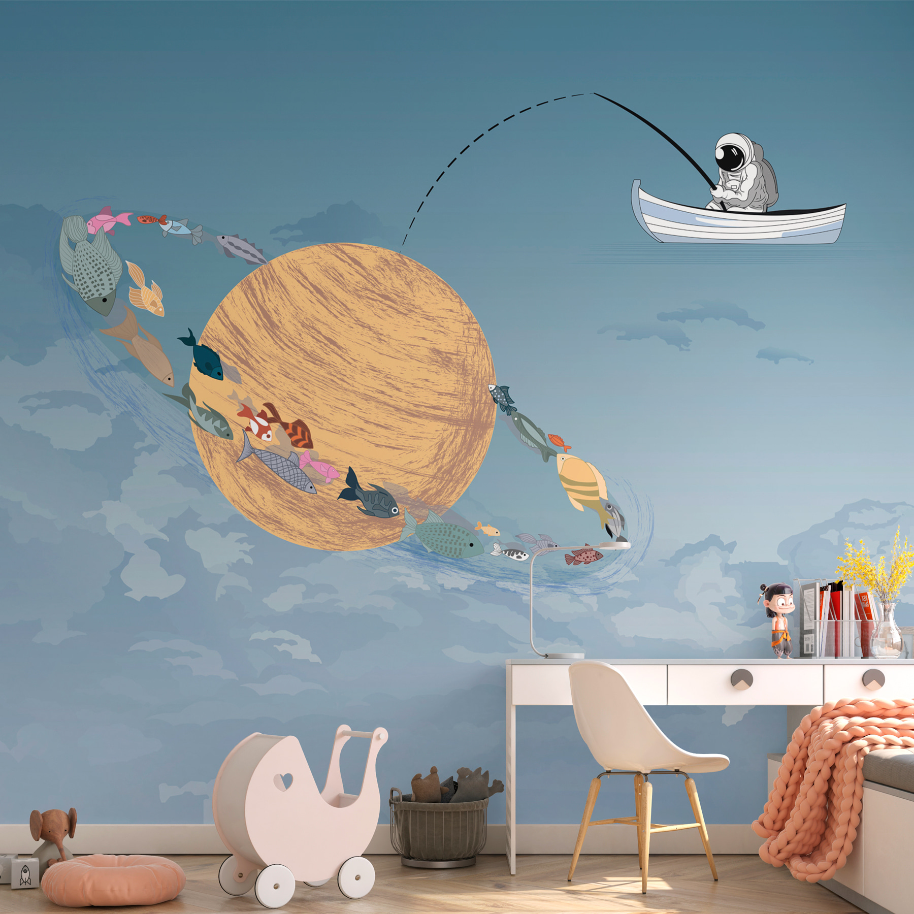Imaginați-vă o mică excursie de pescuit confortabilă, dar în loc de un lac liniștit, plutiți printre nori. Această pictură murală aduce acest vis la viață. Imaginați-vă o scenă capricioasă cu un bărbat într-o barcă, pescuind în cer, cu pești colorați înotând în jurul unei planete gigantice în vârtej. Albastrul strălucitor și albul moale creează o atmosferă senină, perfectă pentru a visa cu ochii deschiși. Este ca o aventură secretă care vă așteaptă chiar deasupra capului. Perfectă pentru camera unui copil sau pentru un spațiu creativ, aceasta stârnește imaginația și adaugă o notă distractivă oricărui perete. Cine nu ar vrea să arunce o linie în nori?