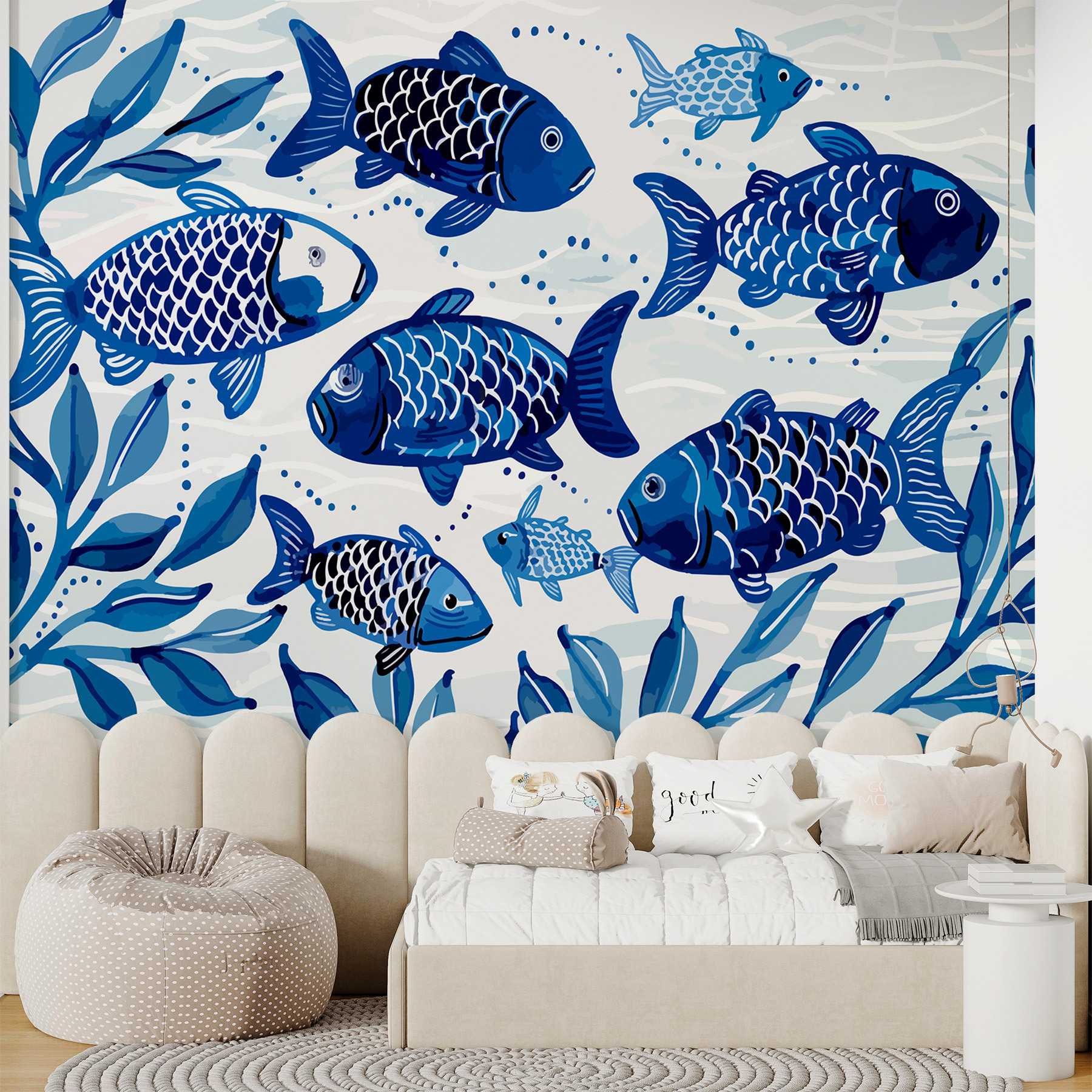 Imaginați-vă peretele transformat într-un tărâm al minunilor subacvatice, cu un banc jucăuș de pești albaștri alunecând fără efort. Această pictură murală este ca un strop de magie oceanică – perfectă pentru cei care visează la evadări pe malul mării. Atmosfera de acuarelă vă face să vă simțiți ca și cum v-ați odihni cu degetele de la picioare în nisip, iar briza blândă a mării vă șoptește secrete. Nu este doar decor; este o mică evadare de fiecare dată când aruncați o privire în direcția sa. Ideal pentru un living confortabil sau un dormitor cu tematică de plajă, este ca și cum ai avea propriul acvariu personal, fără programul de hrănire!