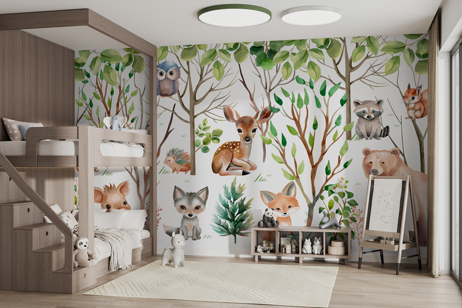 Ah, farmecul sălbăticiei! Imaginați-vă că vă treziți și vă aflați în mijlocul unei păduri de basm. Iată ce aduce în spațiul dvs. această pictură murală “Grup de animale în pădure”. Animale drăguțe din pădure se uită jucăușe – iepuri, bufnițe și chiar un urs curios – fiecare adăugând o notă de fantezie. Este ca un refugiu confortabil la cabana de acasă, fără spray de insecte! Ideal pentru grădinițe sau camere de zi care caută un strop de căldură și uimire. Prietenii s-ar putea chiar să vă întrebe dacă ați ascuns undeva o pădure secretă. Cine ar fi crezut că natura poate fi atât de prietenoasă?