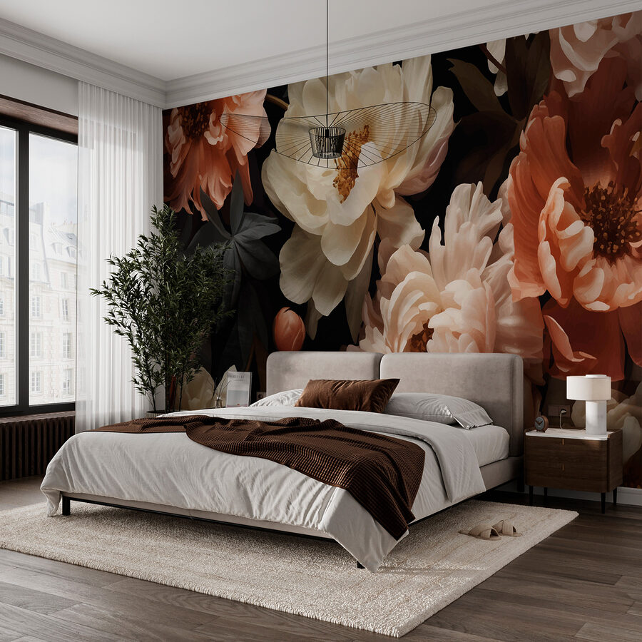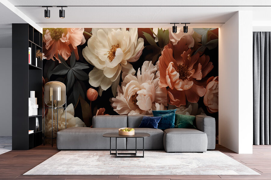 Imaginați-vă că intrați într-o cameră și sunteți întâmpinați de dansul elegant al florilor pe un fundal bogat, întunecat. Această pictură murală aduce încântarea unei grădini la miezul nopții în interior, unde bujorii și alte flori se leagănă subtil, ca și cum ar fi prinse de o briză ușoară. Este o șoaptă a dramei naturii, perfectă pentru a crea un colț confortabil sau pentru a transforma un perete plictisitor într-o piesă statement. Contrastele profunde dau un sentiment de confort și intrigă, ca și cum ai descoperi o grădină secretă în amurg, stârnind un sentiment de aventură și pace în același timp.