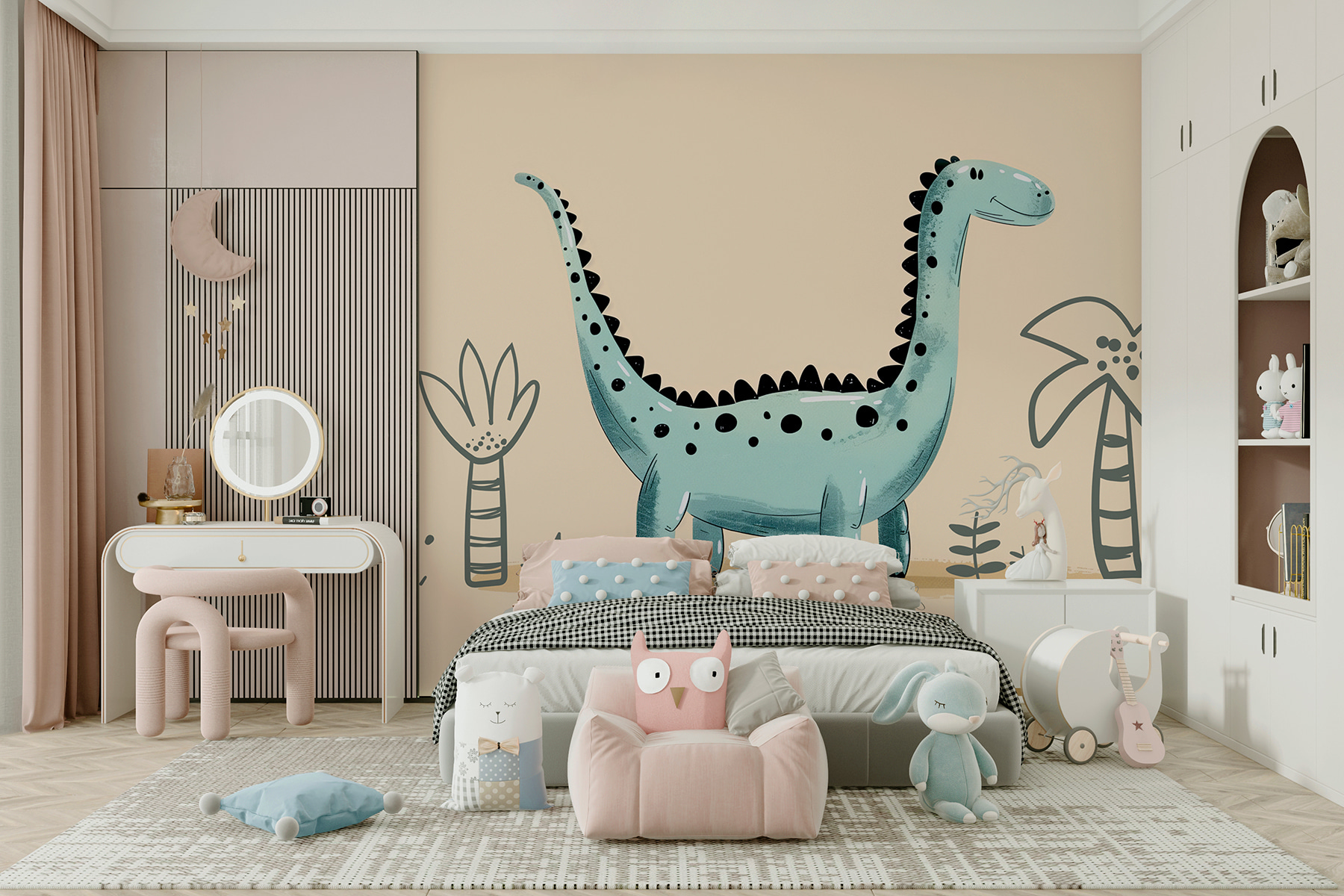 Imaginați-vă că vă treziți în fiecare dimineață cu această creatură veselă… este ca și cum v-ați începe ziua cu o îmbrățișare veselă! Iar plantele mici și palmierii? Ele nu fac decât să sporească atmosfera de junglă preistorică – drăguț, nu-i așa? Este genul de pictură murală care poate transforma un perete plictisitor într-o încântătoare scenă de poveste.
