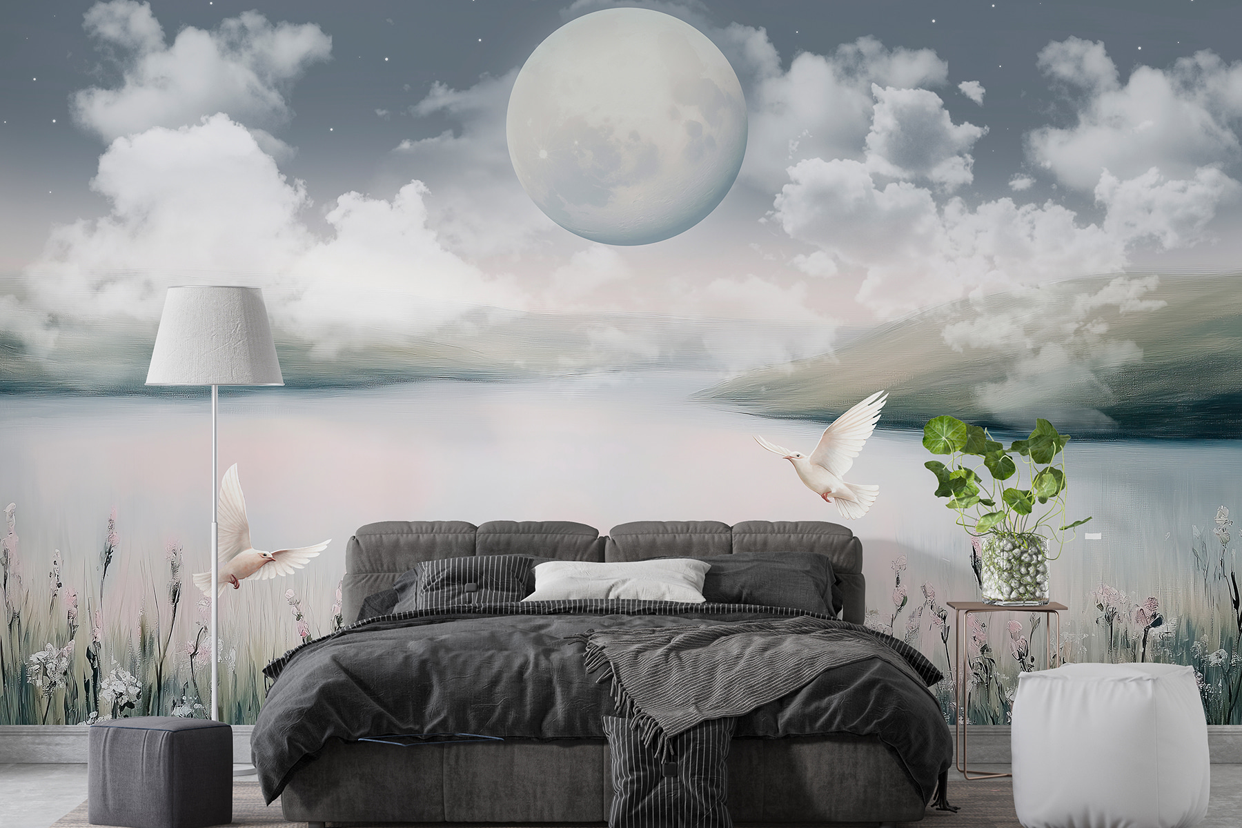Ați dorit vreodată să aduceți un sentiment de calm și uimire în casa dvs.? Acest “Fototapet w01389” ar putea fi exact ceea ce vă trebuie. Imaginați-vă asta – o scenă de vis în acuarelă în care luna stă ușor deasupra unui lac cețos, înconjurată de nori moi și pufoși. Este ca și cum ați păși într-un basm de fiecare dată când intrați în cameră.