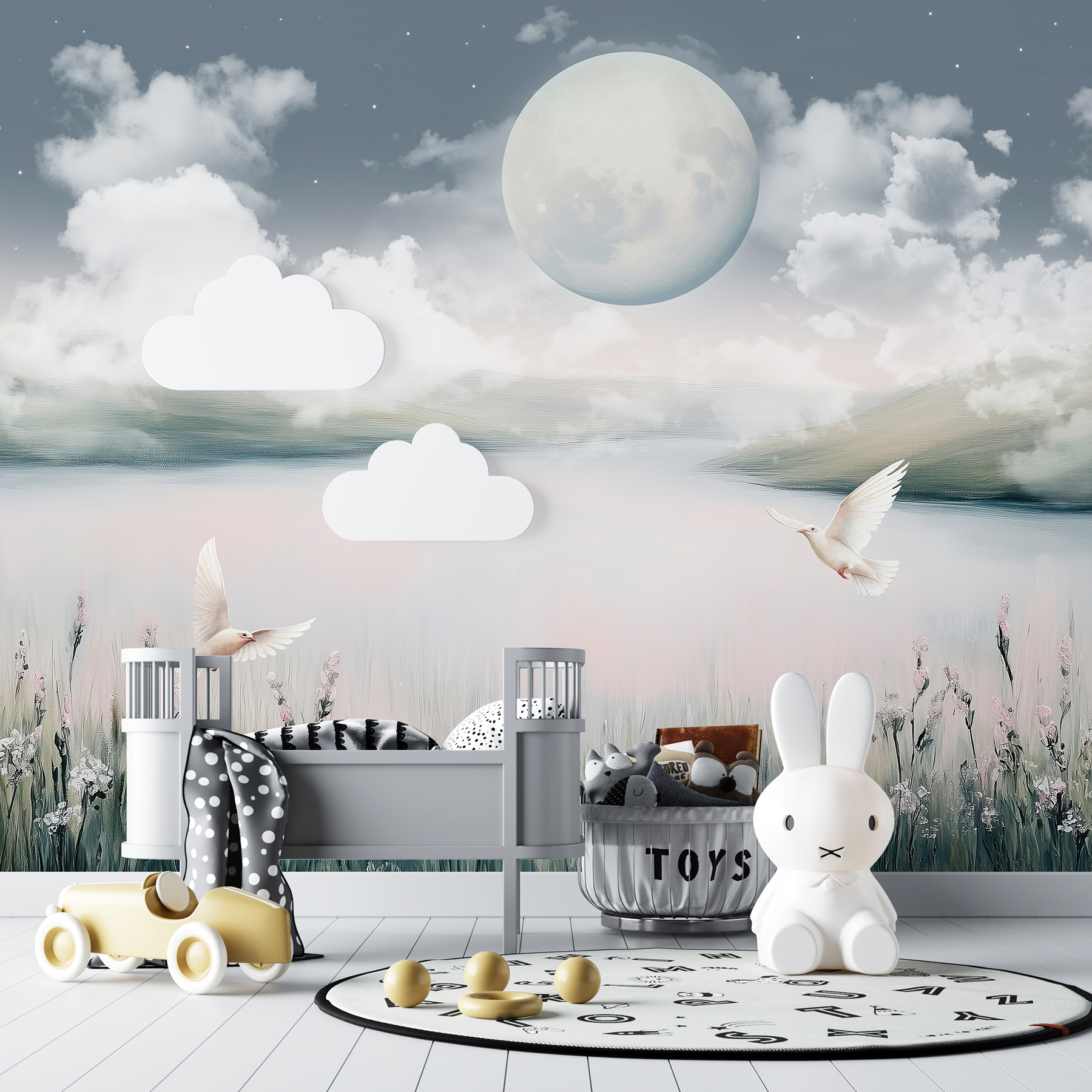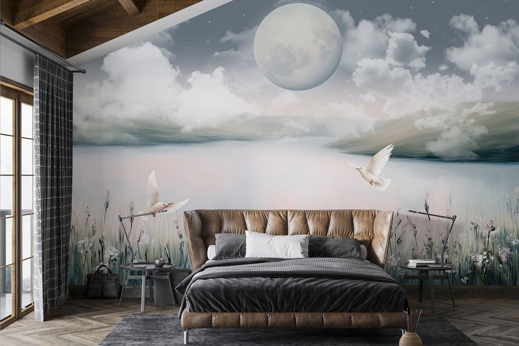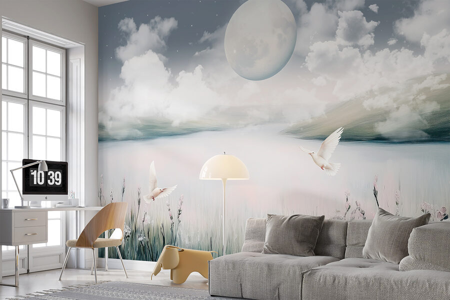 Imaginează-ți că te relaxezi pe canapea, cu o ceașcă de ceai în mână, și te simți ca și cum ai pluti în acest peisaj senin. Diminețile sunt liniștite; serile, absolut magice. Este perfect pentru oricine iubește natura și dorește o notă de fantezie. Bonus? Florile pastelate și păsările adaugă o notă de farmec, fără a fi prea exagerate. Cu siguranță un starter de conversație la următoarea cină de familie! 🌙✨