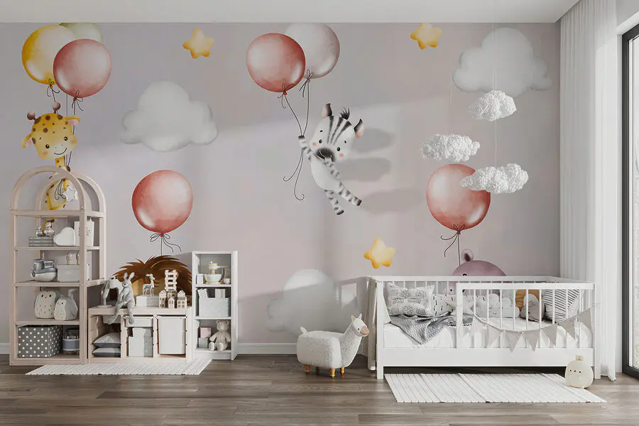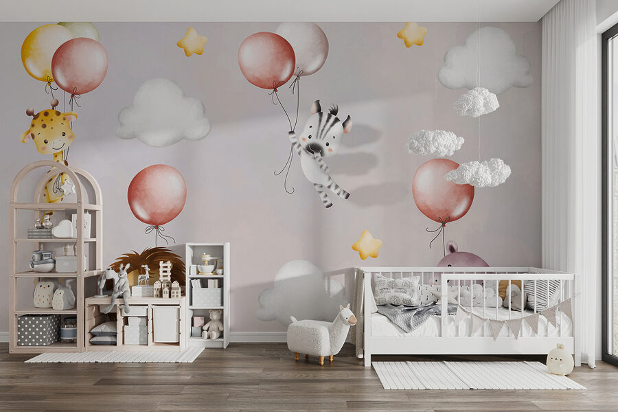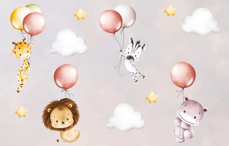 Transformați instantaneu orice cameră într-o țară a minunilor capricioasă cu “Fototapet w01405” – perfect pentru copii sau ca o atingere dulce într-o cameră de copii. Imaginați-vă aceste creaturi adorabile – girafe drăguțe, zebre, lei și hipopotami – plutind pe baloane în culori pastelate, printre nori pufoși și stele sclipitoare. Va face pe oricine să zâmbească! Scena de vis și nuanțele blânde creează o atmosferă liniștită și jucăușă – ideală pentru a stimula imaginația copilului dumneavoastră. Imaginează-ți poveștile de adormit care se desfășoară sub privirile lor atente – este magie pură! Chiar și adulții ar putea fi tentați să arunce o privire. Această pictură murală este un amestec încântător de farmec și seninătate, fiind un element indispensabil pentru orice casă.