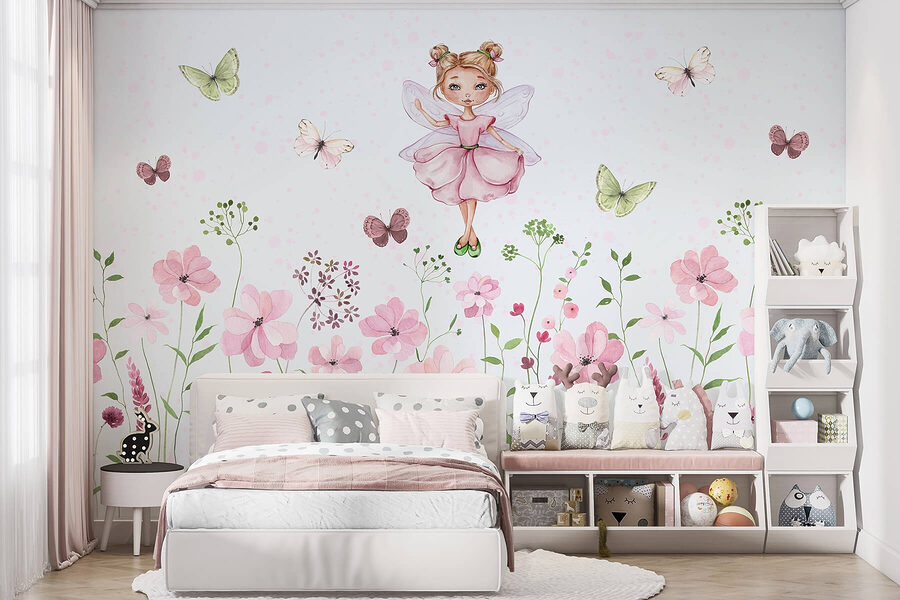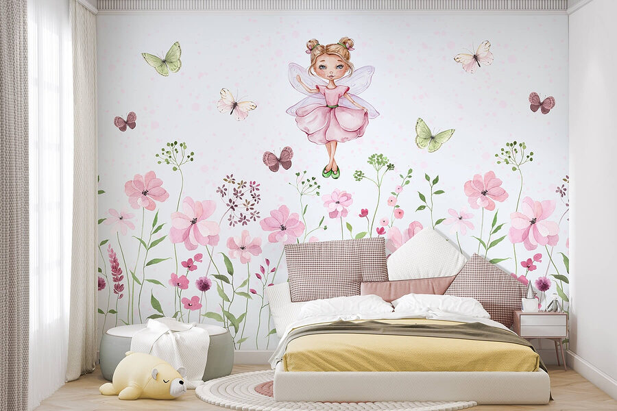 Fototapet Fototapet Acuarelă a unei zâne într-o rochie roz înconjurată de flori (SKU: w01460)