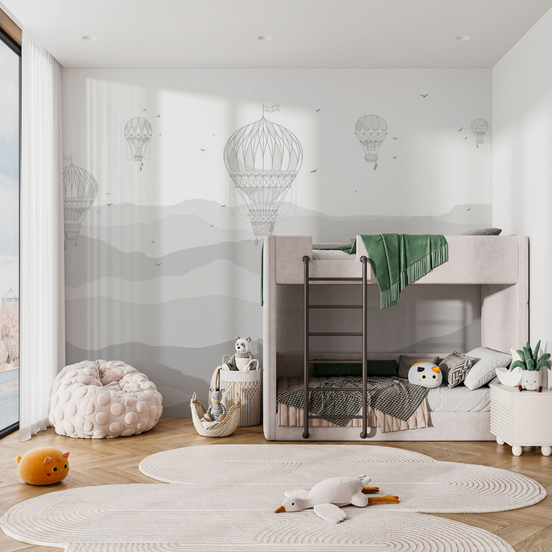 Munții blânzi în tonuri de gri și baloanele aerisite aproape că vă aduc în minte o briză ușoară – nu o puteți simți? Poate că vă sorbiți cafeaua de dimineață sau vă relaxați după o zi lungă, uitându-vă la această pictură murală… și dintr-o dată vă aflați la 3.000 de metri înălțime, plutind printre nori. Nu este doar un decor de perete; este o întreagă vibrație – blândă, visătoare și ușor magică… exact ceea ce nu știai că spațiul tău are nevoie!