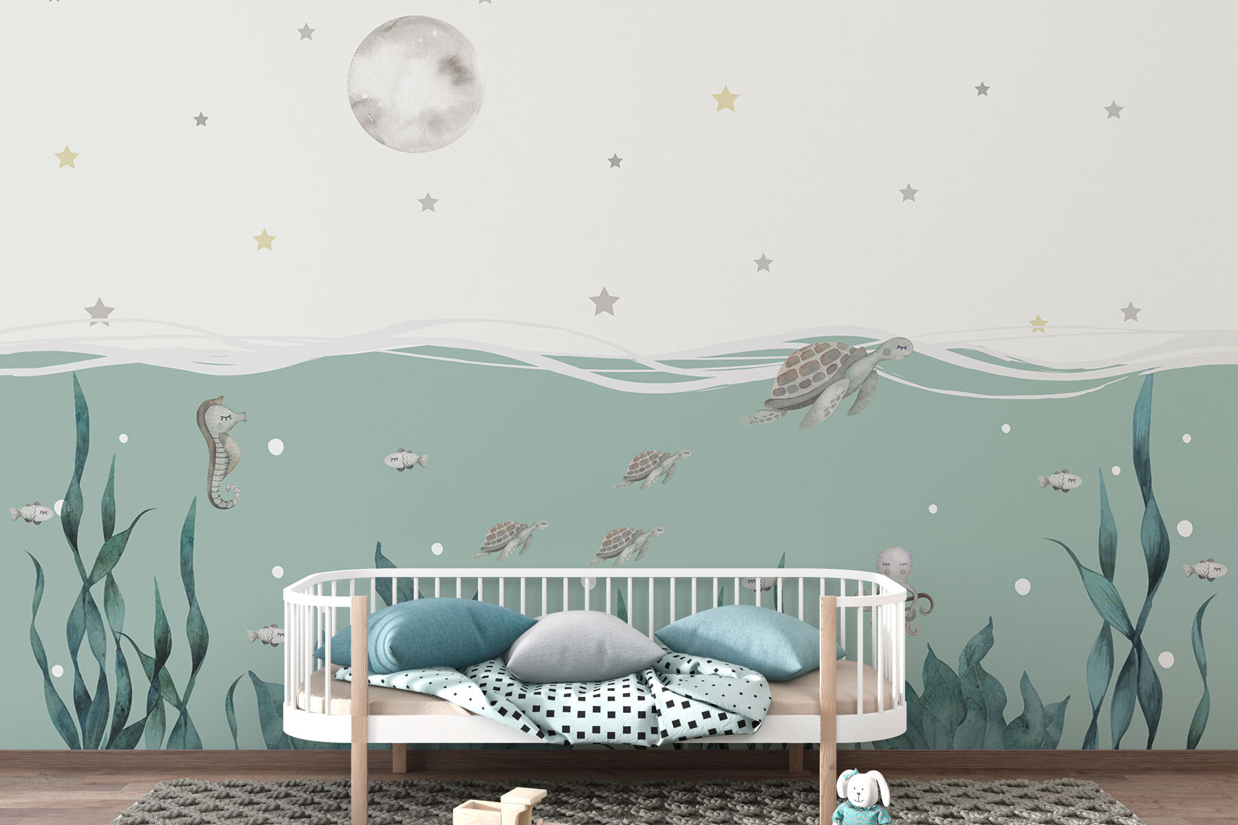 Imaginați-vă că vă scufundați într-o lume subacvatică senină de fiecare dată când intrați în cameră. Această pictură murală “Seaweed & Seahorses” surprinde dansul blând al creaturilor marine sub un cer de noapte înstelat. Este ca și cum pereții dvs. au făcut o scufundare încântătoare în ocean. Perfect pentru orice spațiu care are nevoie de o notă de fantezie sau de o atmosferă liniștitoare. În plus, cine nu vrea să privească micile țestoase alunecând în timp ce își bea cafeaua de dimineață? Haideți, adăugați un strop de litoral decorului dvs. și lăsați imaginația să înoate liberă!
