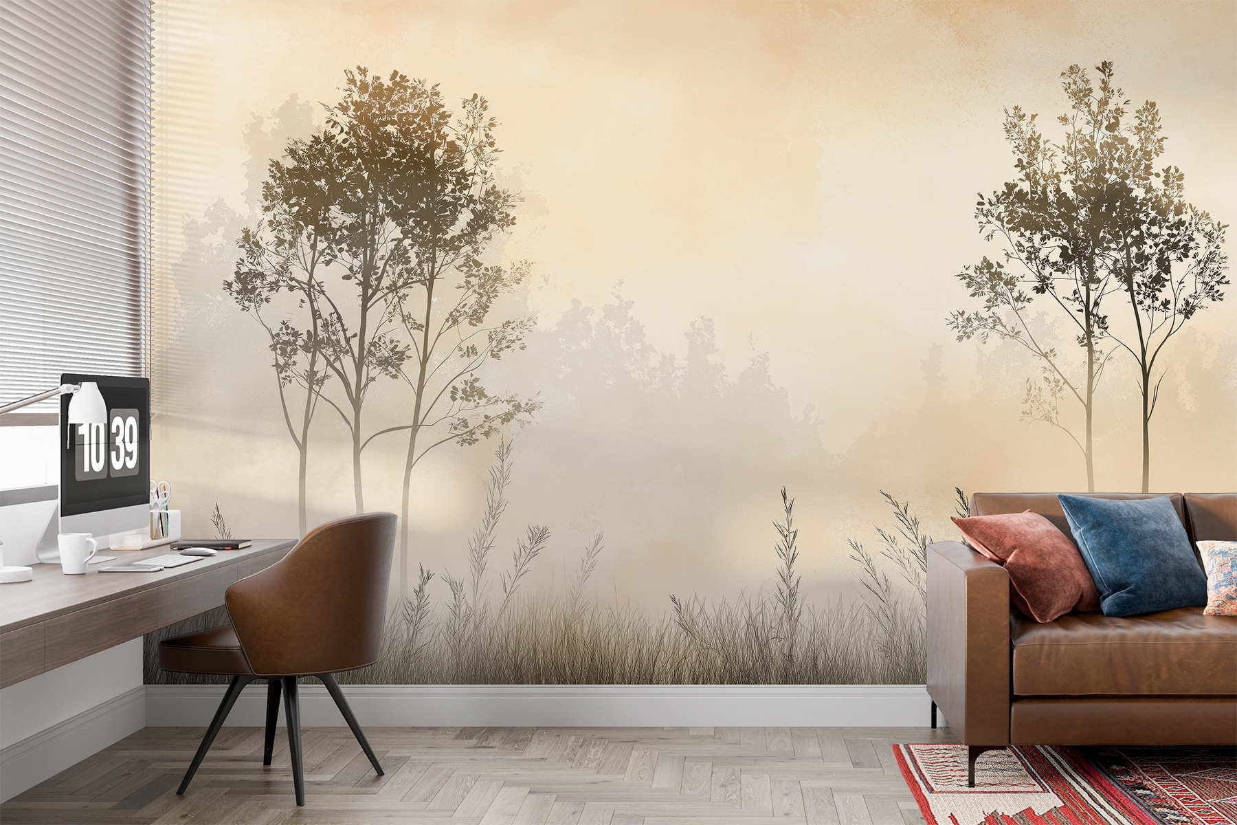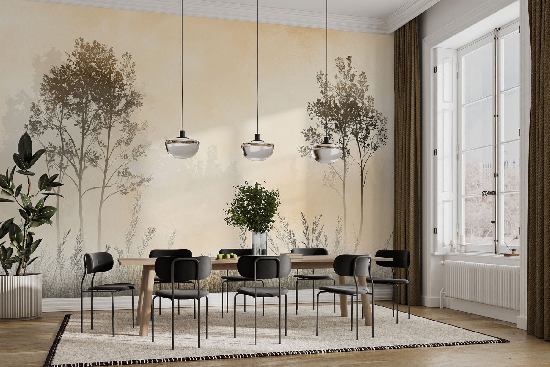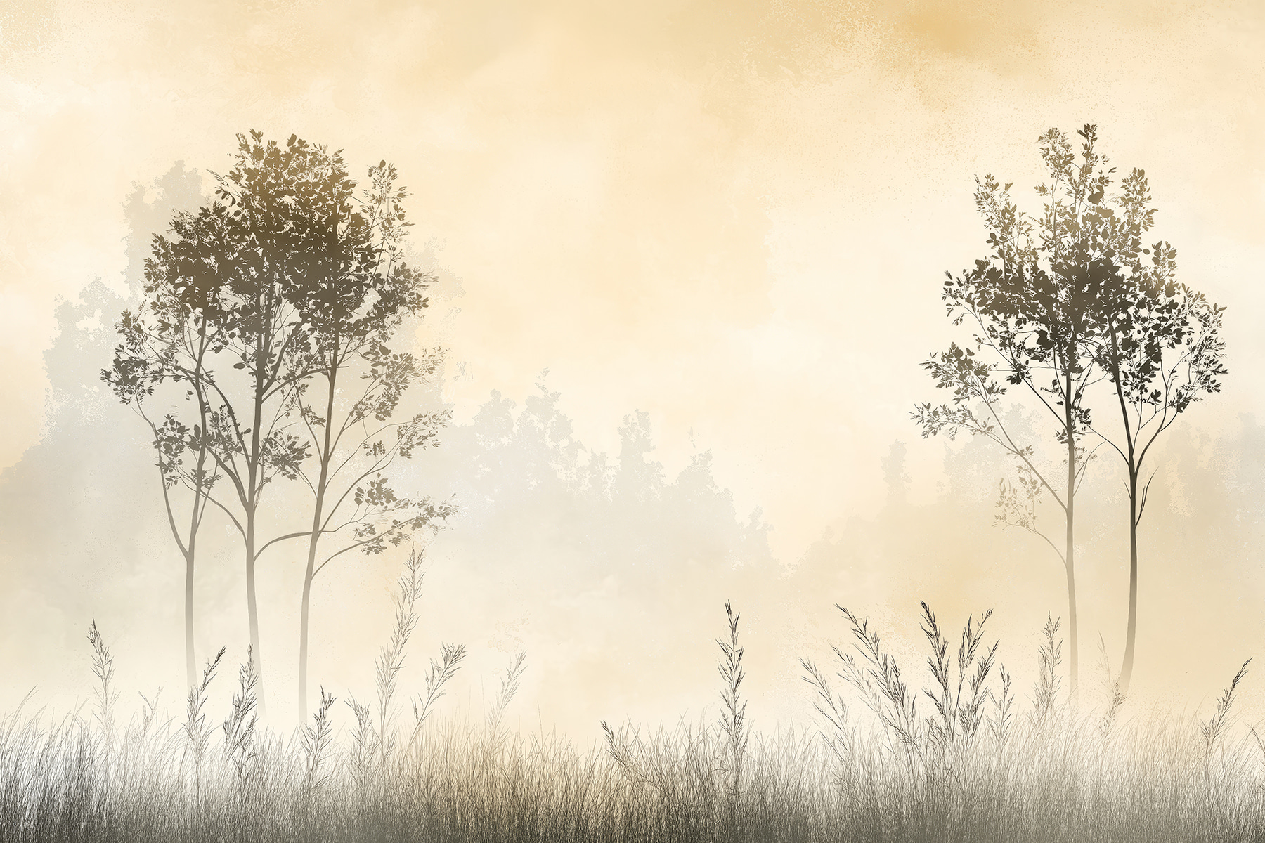 Imaginați-vă că vă treziți în fața acestei picturi murale de vis – “Peisaj cețos cu copaci și iarbă”. Este ca și cum ai păși într-o pădure senină chiar din sufrageria ta. Știți vibrația aceea liniștitoare a unei dimineți liniștite? Aceasta o surprinde perfect. Ceața moale se înfășoară în jurul copacilor grațioși, prin care se întrezărește iarba. Perfect pentru a transforma un perete simplu în propriul tău refugiu liniștit.