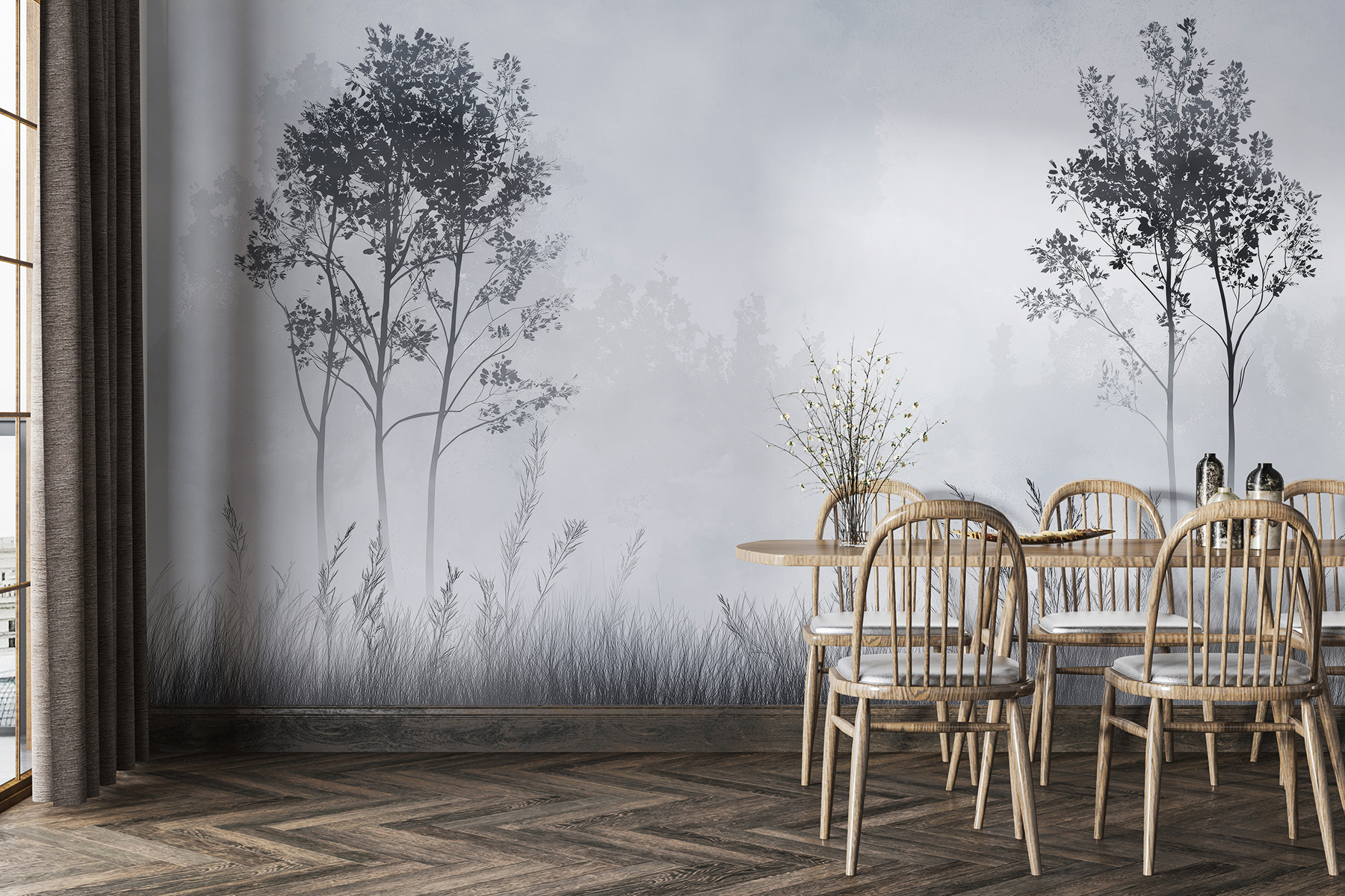 Transformați orice cameră într-o evadare senină cu acest peisaj mural cețos. Imaginați-vă o ceață blândă rostogolindu-se peste iarbă moale și copaci delicați, creând o atmosferă de vis, perfectă pentru a visa cu ochii deschiși sau pentru a vă relaxa după o zi lungă. Tonurile stinse invită la calm, făcând-o ideală pentru spații confortabile precum un colț de lectură sau un dormitor liniștit. Imaginați-vă: sorbind ceai, înconjurat de natură, cu o briză ușoară în minte. Este ca și cum ai aduce aerul liber înăuntru – fără pantofii plini de noroi! Un fundal perfect pentru momentele în care lumea pare un pic prea agitată, acest mural șoptește liniște.