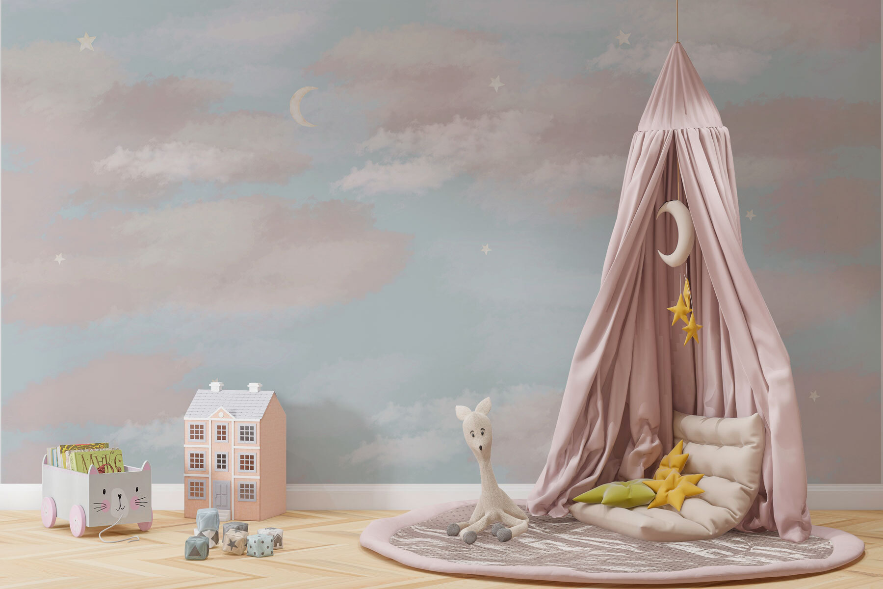 Imaginați-vă că stați întins pe canapea și vă uitați la un cer perfect – fără insecte și vreme imprevizibilă. Acest “Wall Mural: Blue Sky with Clouds and a Crescent Moon” aduce vibrații senine în interior, transformând un perete banal într-o pânză de visat cu ochii deschiși. Norii pufoși plutesc leneș, luna în semilună adaugă un strop de magie, iar nuanța de albastru blând? Ei bine, practic șoptește “relaxare”. Perfectă pentru orice spațiu care tânjește după calm și farmec. Prietenii s-ar putea să vă întrebe dacă v-ați mutat afară. Haideți, răsfățați-vă pereții!