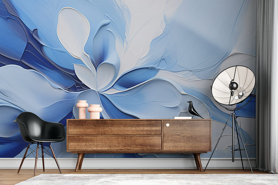 Imaginați-vă că intrați într-o cameră și simțiți că plutiți într-o mare senină de albastru. “Eleganță în tonuri de albastru” este ca o îmbrățișare blândă, cu modelele sale florale moi și ample care par să șoptească “relaxați-vă”. Această pictură murală aduce o notă de rafinament calm în orice spațiu, fiind perfectă pentru un colț de lectură sau o zonă de living liniștită. Este ca și cum cineva ar fi capturat esența unui cer liniștit de după-amiază și ar fi pictat-o pe peretele tău. Și hei, cine ar fi crezut că albastrul poate fi atât de cald și primitor? Perfect pentru cei care iubesc un decor atemporal, dar modern.