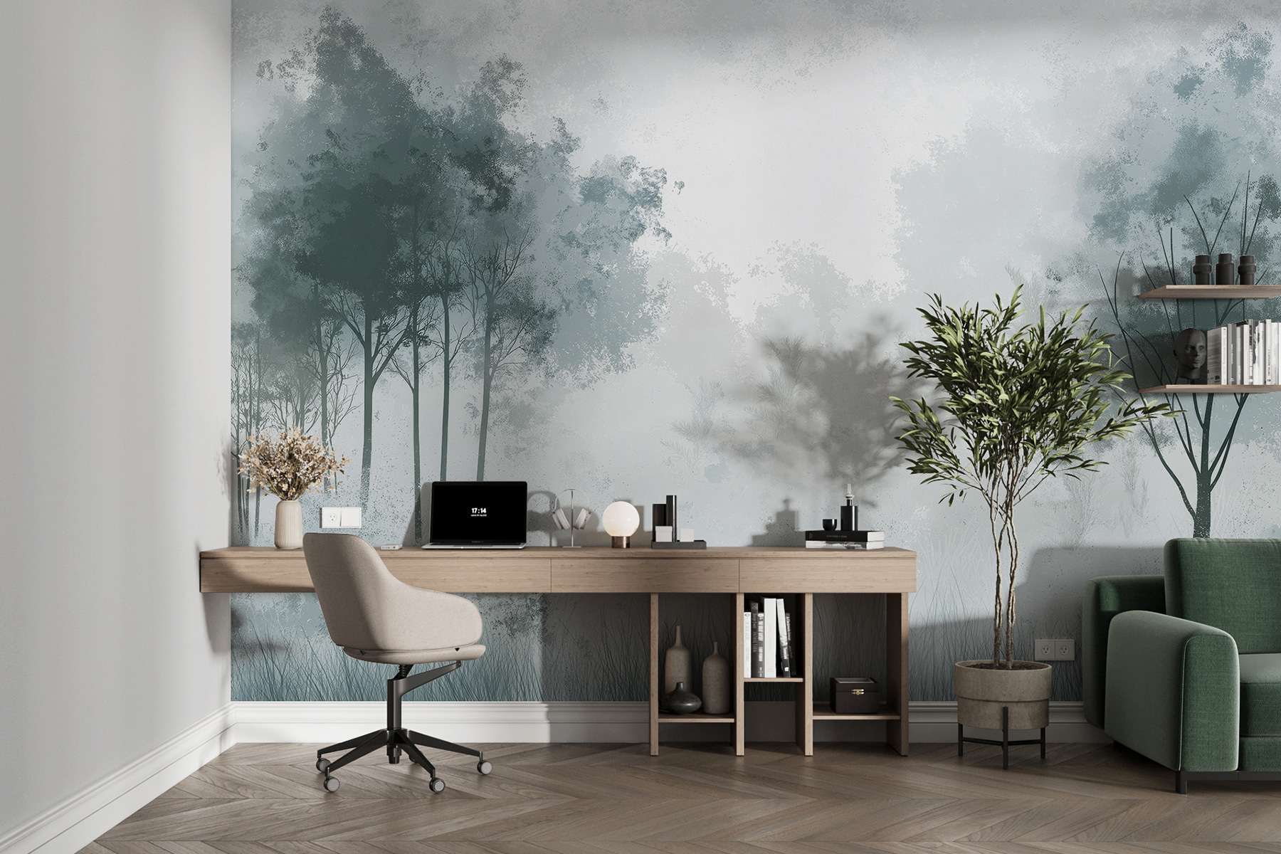 Imaginați-vă că vă treziți în fiecare zi în dimineți cețoase, fără să aveți nevoie de umbrelă. Această pictură murală “Foggy Forest with Trees” vă învăluie camera în liniște și o notă de mister, ca și cum ați păși într-o scenă de film cu păduri de vis. Este perfectă pentru atunci când aveți nevoie de o pauză de la agitația cotidiană. S-ar putea chiar să începeți să vă așteptați ca creaturile pădurii să apară și să vă salute! O ambianță blândă și un vibe pașnic care face ca și cea mai aglomerată casă să se simtă ca o evadare senină.
