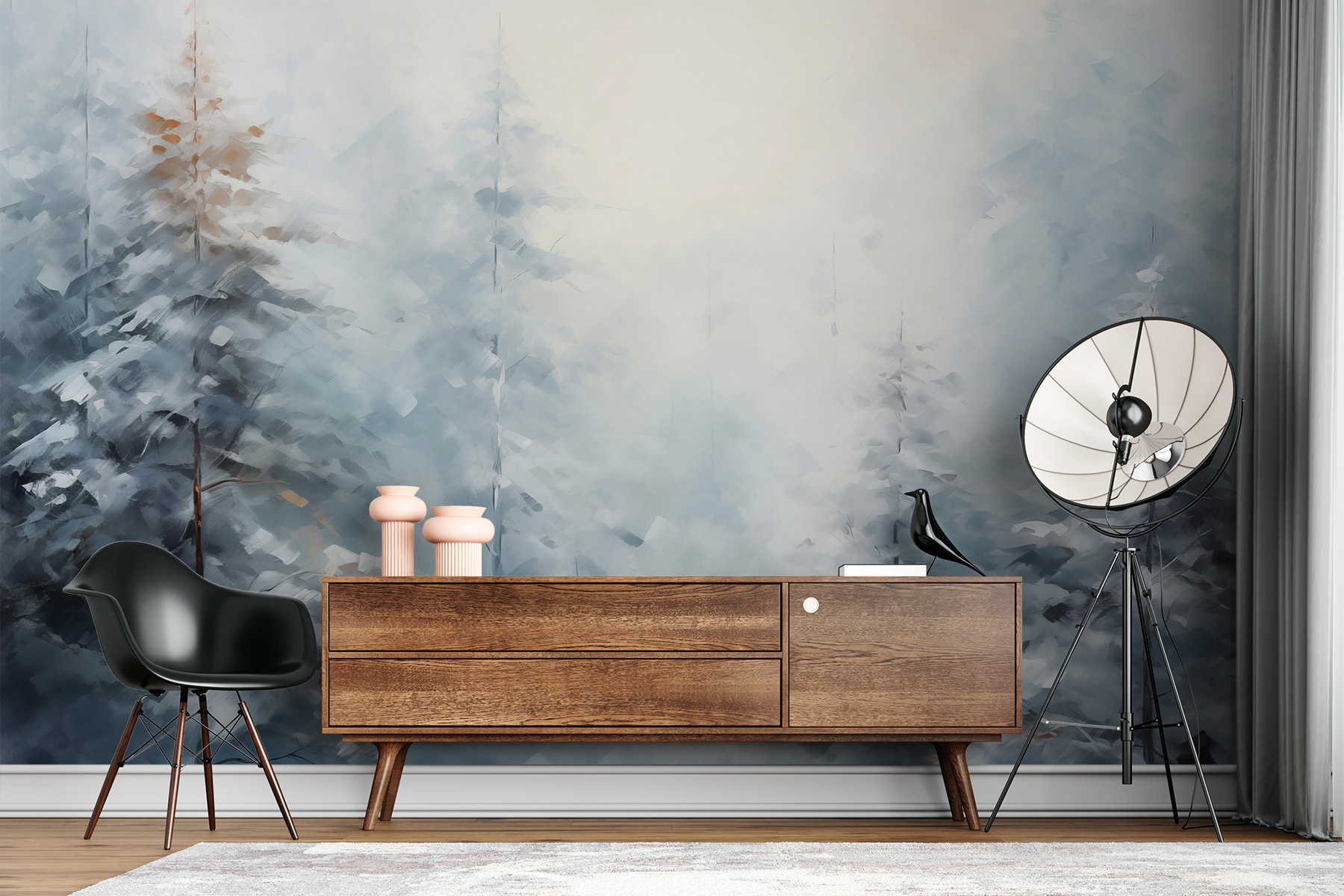 Imaginați-vă că pășiți într-o cameră și vă simțiți ca și cum ați fi purtat într-o țară a minunilor de iarnă senină. Această pictură murală, cu o reprezentare de vis a copacilor acoperiți de zăpadă, aduce acea atmosferă magică de pădure chiar în casa ta. Imaginați-vă sorbind cacao fierbinte în timp ce o priviți, simțind o răcoare blândă în aer – chiar dacă este mijlocul verii. Perfect pentru iubitorii de natură și pentru cei care au nevoie de puțină liniște în viața lor haotică. Este ca o îmbrățișare din partea naturii, fără degerături. Drăguț, răcoros și minunat de calmant!