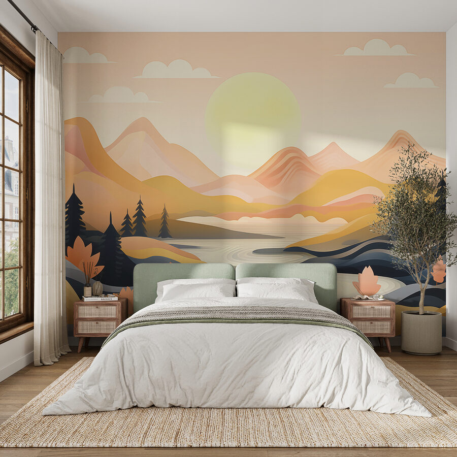 Imaginați-vă că aveți o fereastră care se deschide spre un râu care șerpuiește liniștit printr-o vale senină, încadrată de munți scăldați într-o lumină blândă. Această pictură murală nu este doar artă de perete – este ca și cum ai deține un moment de pace înghețat în timp. Perfect pentru orice cameră în care doriți puțină liniște. Imaginați-vă stând cu o ceașcă de ceai, cu frumusețea naturii împodobindu-vă spațiul. Curbele blânde și culorile calme au ceva care șoptește relaxare. Este ca o îmbrățișare a naturii, fără insecte. Ideal, nu?