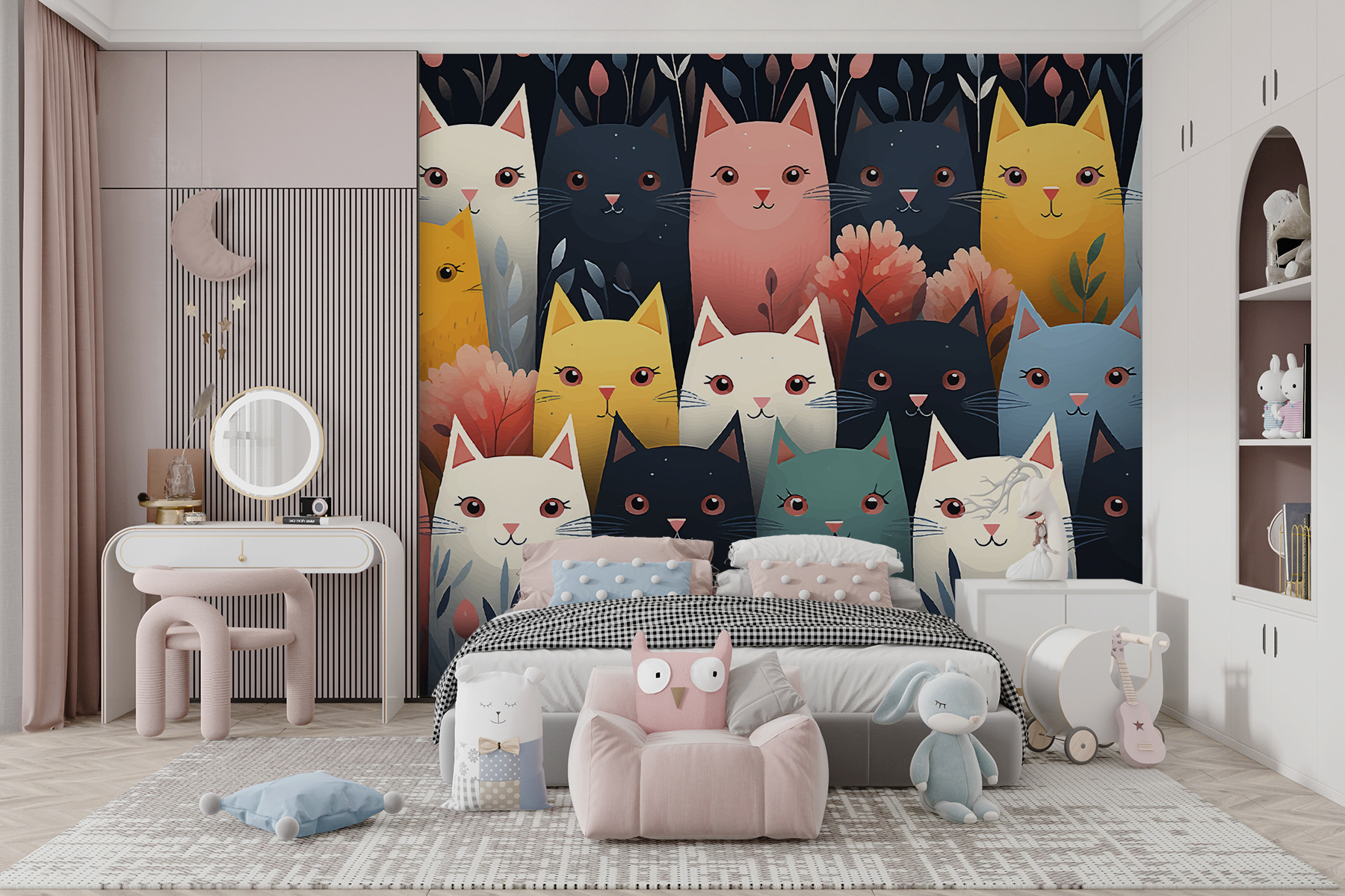 Căutați să adăugați ceva fantezie spațiului dvs.? Aruncați o privire la această pictură murală jucăușă intitulată “Grup de pisici cu flori”. Imaginați-vă un grup de pisicuțe colorate – roz aprins, verde și galben – așezate printre flori vesele. Este ca o petrecere în grădină, dar cu pisici! Perfect pentru oricine iubește un strop de culoare și un strop de bucurie. Aceste prietene feline aduc farmec și un strop de neastâmpăr în orice cameră, gâdilându-vă spiritul creativ de fiecare dată când treceți pe acolo. Te gândești să amenajezi un colțișor confortabil? Aceste pisici te susțin – sau cel puțin îți susțin peretele!