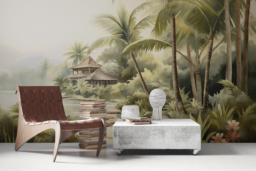 Imaginează-ți că intri în sufrageria ta și ești întâmpinat de propriul tău paradis tropical. Această pictură murală în acuarelă, cu casa sa de vis cuibărită printre palmieri, nu este doar atârnată pe perete, ci vă transformă spațiul într-o evadare exotică. S-ar putea să simțiți o briză caldă sau nevoia de a sorbi o băutură fructată! Perfectă pentru a adăuga un strop de fantezie și liniște, această pictură murală este cea mai bună sursă de conversație. În plus, are un aer relaxat, ca și cum casa ta ar fi decis că are nevoie de o vacanță permanentă. Cine nu și-ar dori asta?